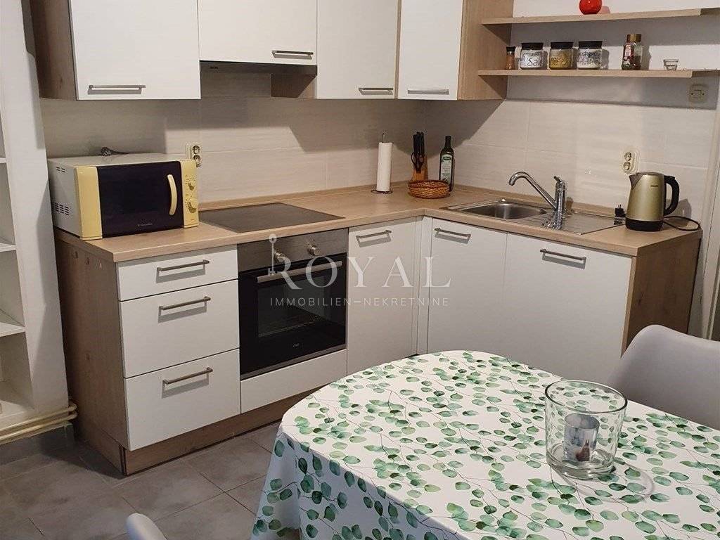 Posredujemo u najmu komfornog 2S+DB stana u širem centru grada, 6 min hoda od Korza. Stan je površine 90m2, smješten je na prvom katu te ima djelomičan pogled na more. Osim dnevnog boravka sadrži dvije velike spavaće sobe od kojih se u jednoj krevet može razdvojiti pa postoji mogućnost dva odvojena ležaja. Sobe sadrže velike ormare i radne stolove s udobnim radnim stolicama te je stoga stan savršen za rad od kuće. Postoji optički internet i max tv. Od kupaonice su potpuno odvojena 2 wc-a što omogućava potpuni komfor. Iz dnevnog boravka je izlaz na manji dvorišni balkon. Grijanje je riješeno putem plinskog etažnog grijanja i klima. Stan se izdaje dugoročno.