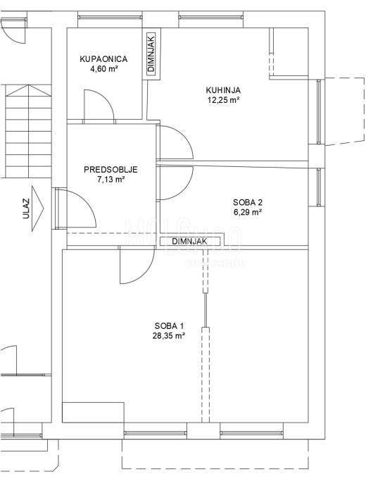 - soba 2 (jugozapad): 28,35 m2 – pregrađena s montažnom drvenom stijenom na dvije sobe približno iste površine,