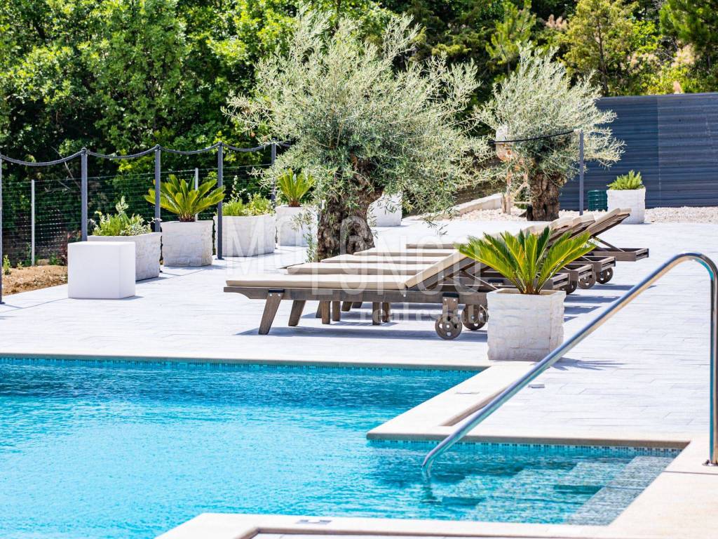 Bazen je sa svih strana okružen prostornim segmentima za dodatno uživanje poput stola za blagovanje na natkrivenoj terasi, te sunčališta sa ležaljkama uz bazen.
