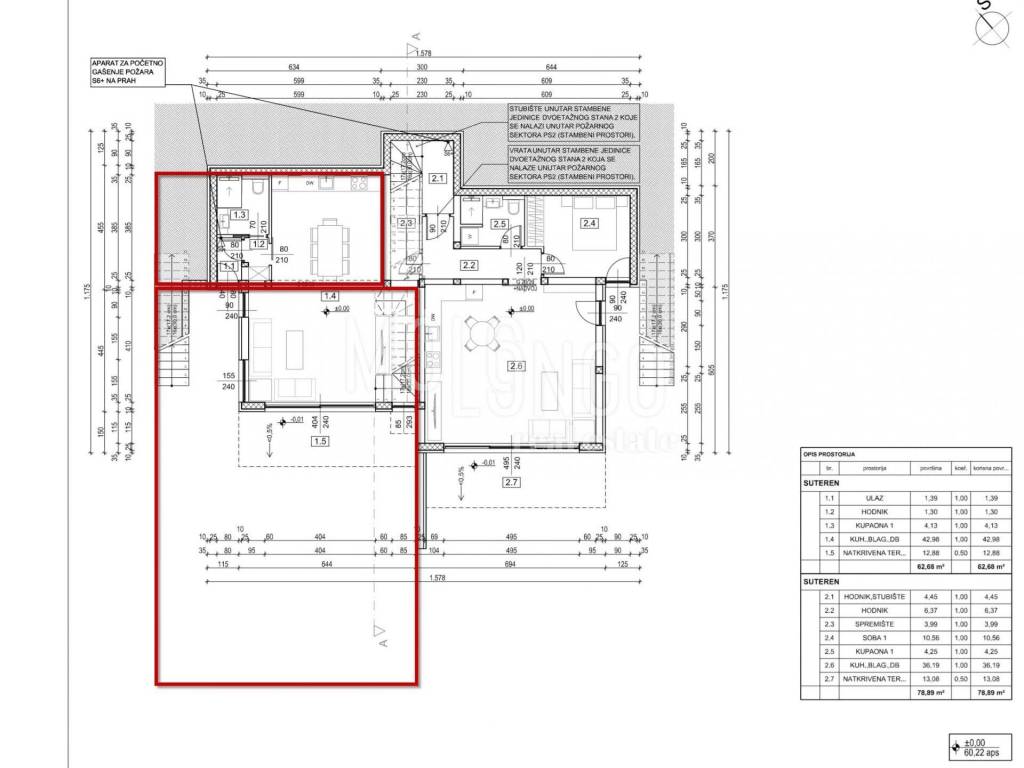 Donja etaža sastoji se od hodnika, kupaone, te open space dnevnog boravka s kuhinjom i blagavaonom koji se produžuje na natkrivenu terasu površine 13 m2. Osim toga stanu pripada oko 200 m2 okućnice sa vlastitim parkirnim mjestima, bazenom, vrtom i drugim sadržajima.