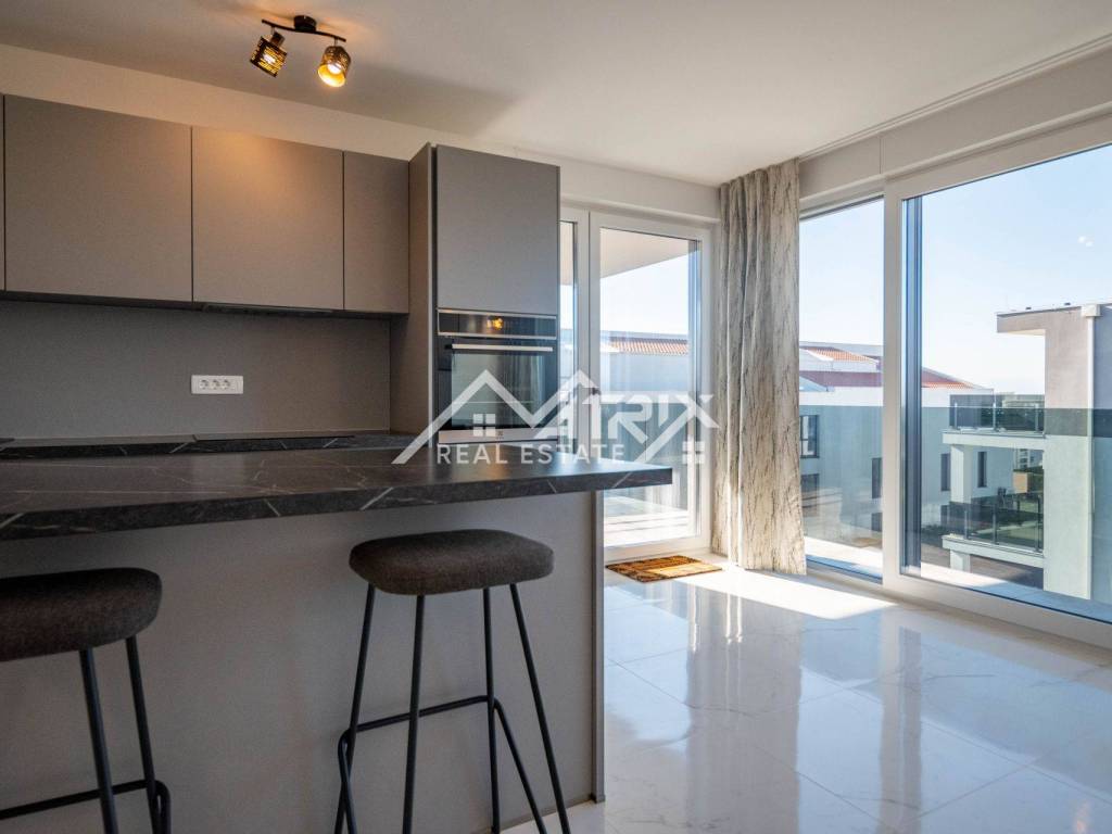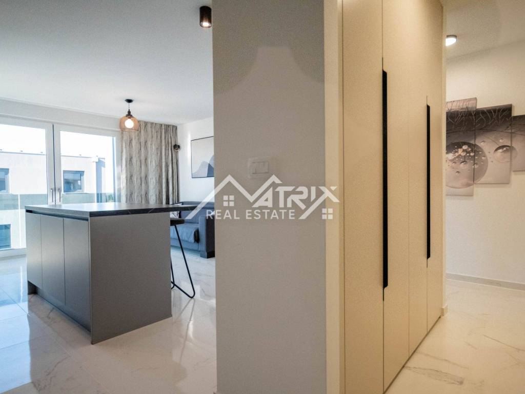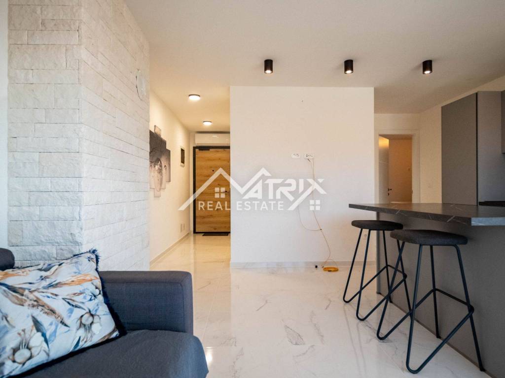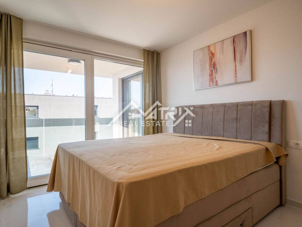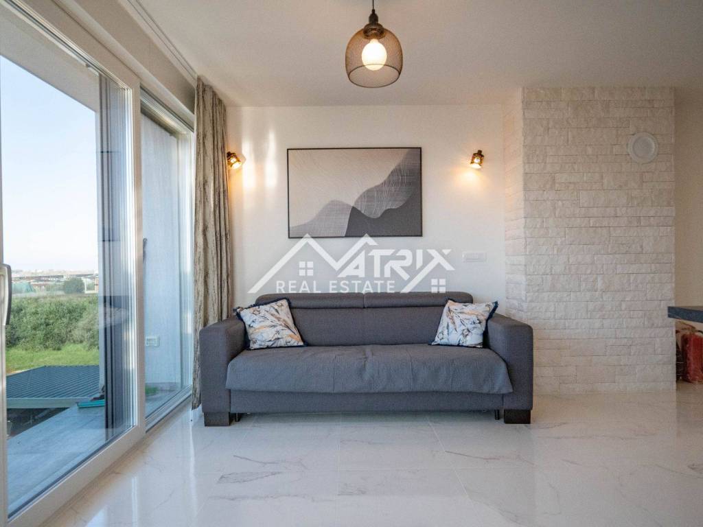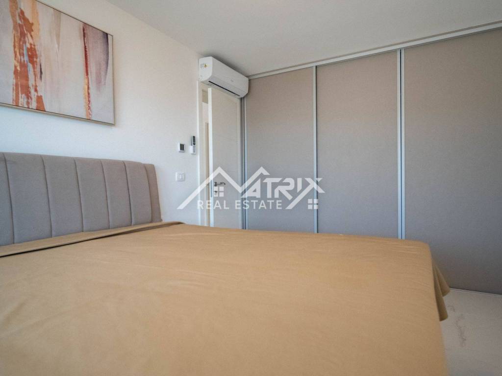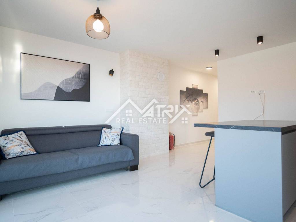 Stan se nalazi na drugom katu suvremeno projektirane zgrade te je promišljeno raspoređen. Sastoji se od dvije spavaće sobe, kupaonice, kuhinje s blagovaonicom te dnevnog boravka s izlazom na natkrivenu terasu s lijepim pogledom na more.