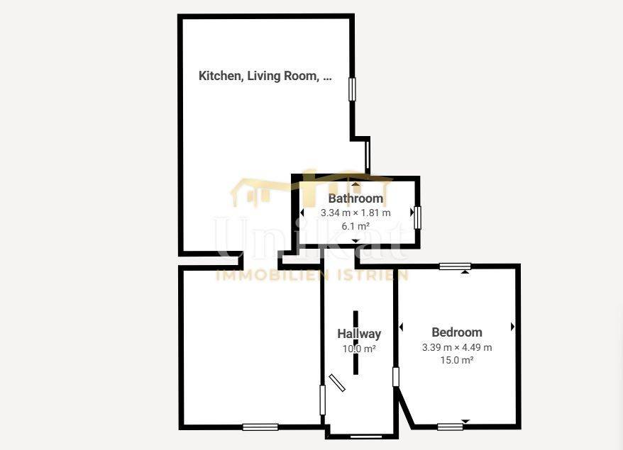 U prizemlju se nalaze dnevni boravak, zasebna, velika kuhinja s blagovaonom, jedna spavaća soba i kupaonica te mala ostava ispod stepeništa. Kuhinja ima direktni izlaz na stražnji dio dvorišta, a posebnost je krovni prozor u kuhinji koji daje lijepo prirodno svijetlo.