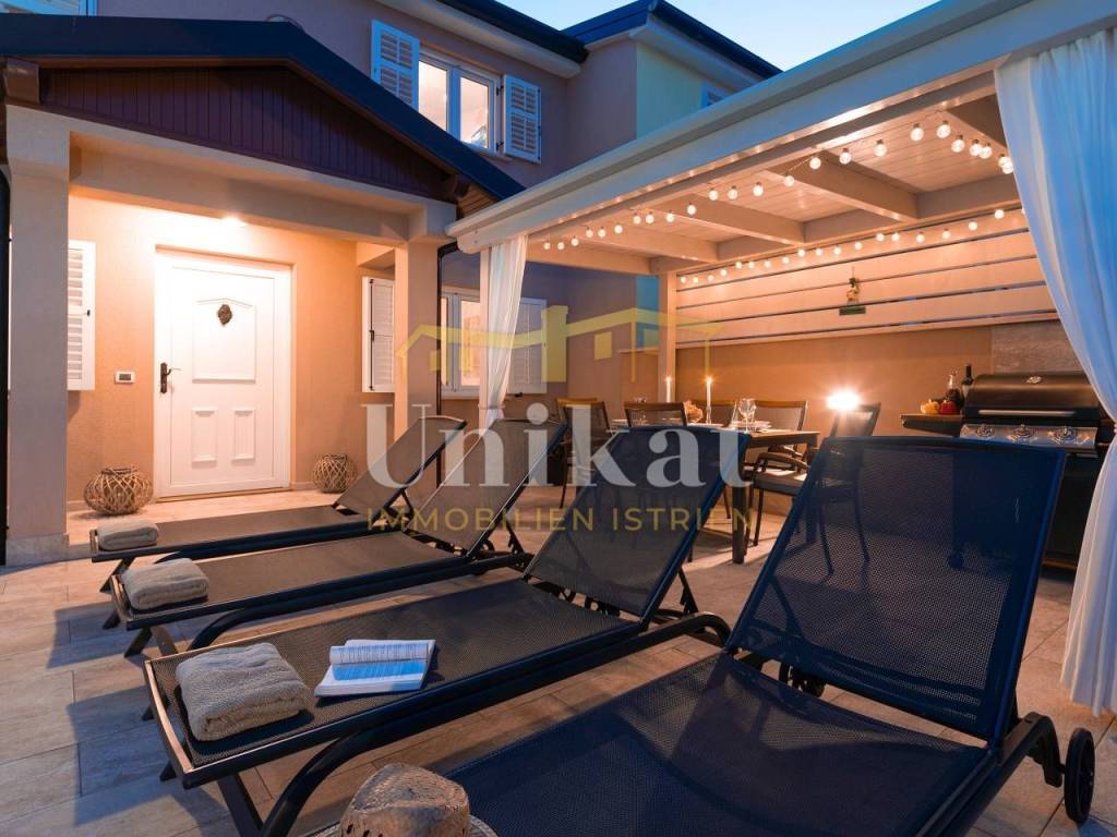 Ispred kuće se nalazi vrt s natkrivenom ljetnom kuhinjom, vrt je ograđen.