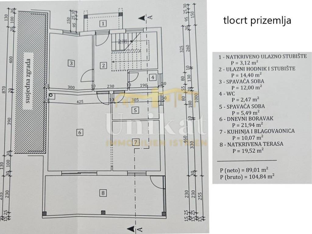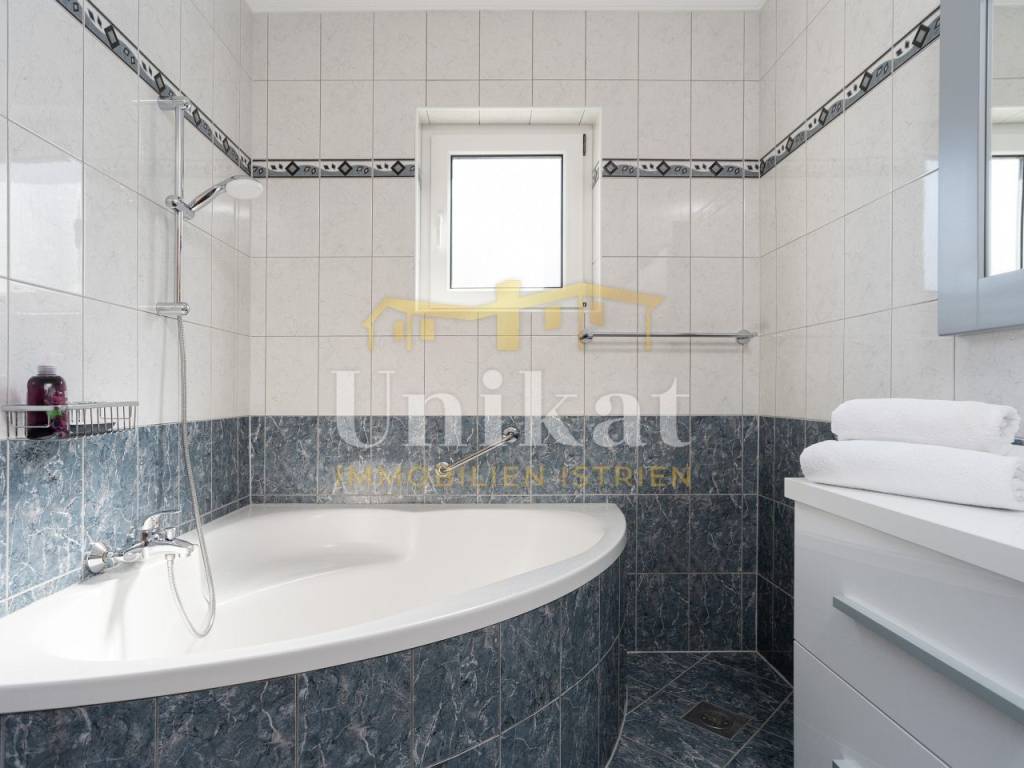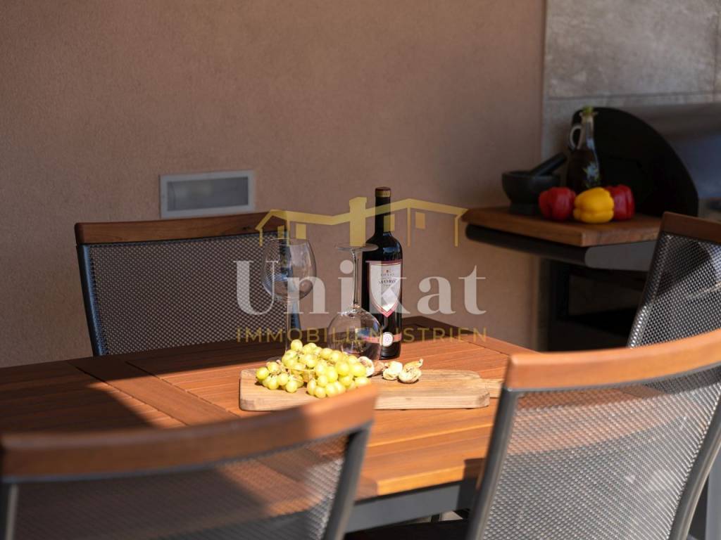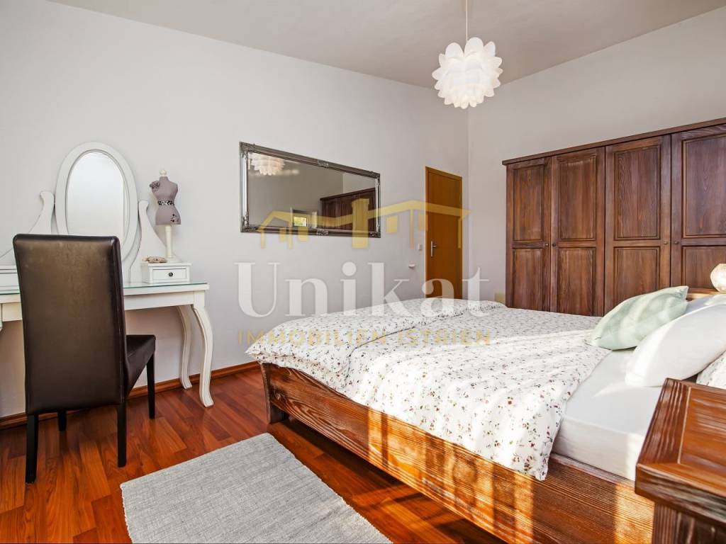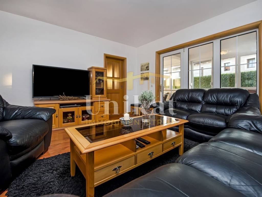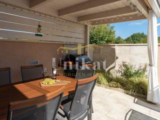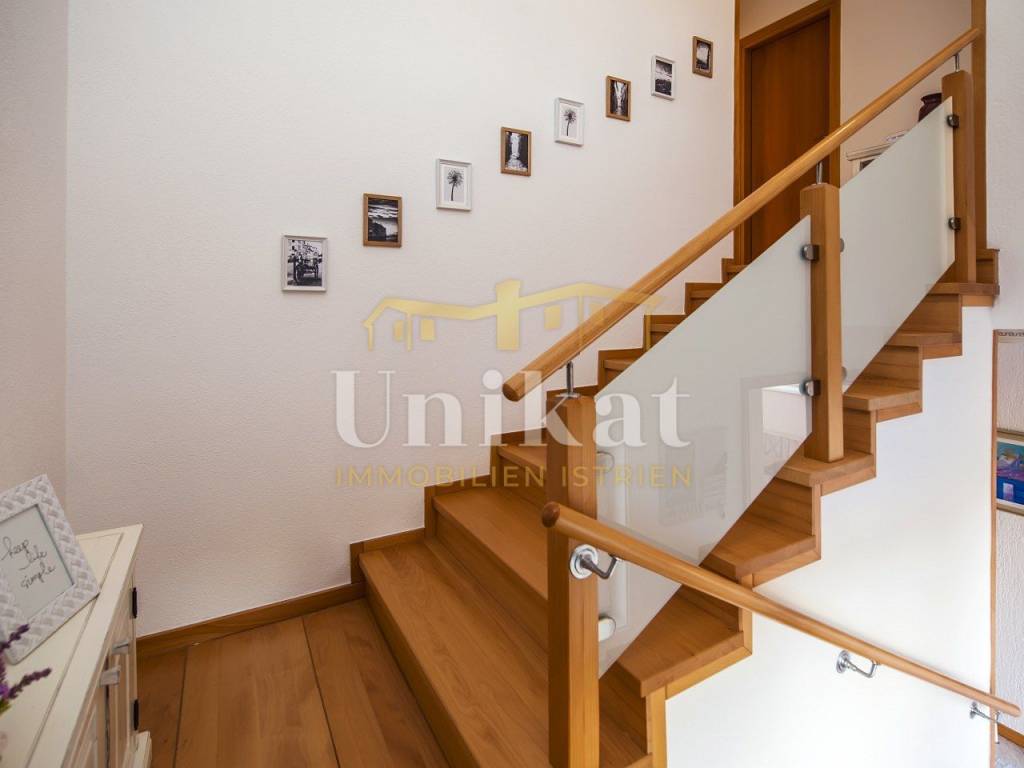 U prizemlju se nalaze dnevni boravak, zasebna kuhinja s blagovaonicom, jedna spavaća soba, kupaonica i zaseban WC za goste. Dodatno postoji velika loggia koja ja uređena kao prostorija za opuštanje odnosno dodatna, veća blagovaonica.