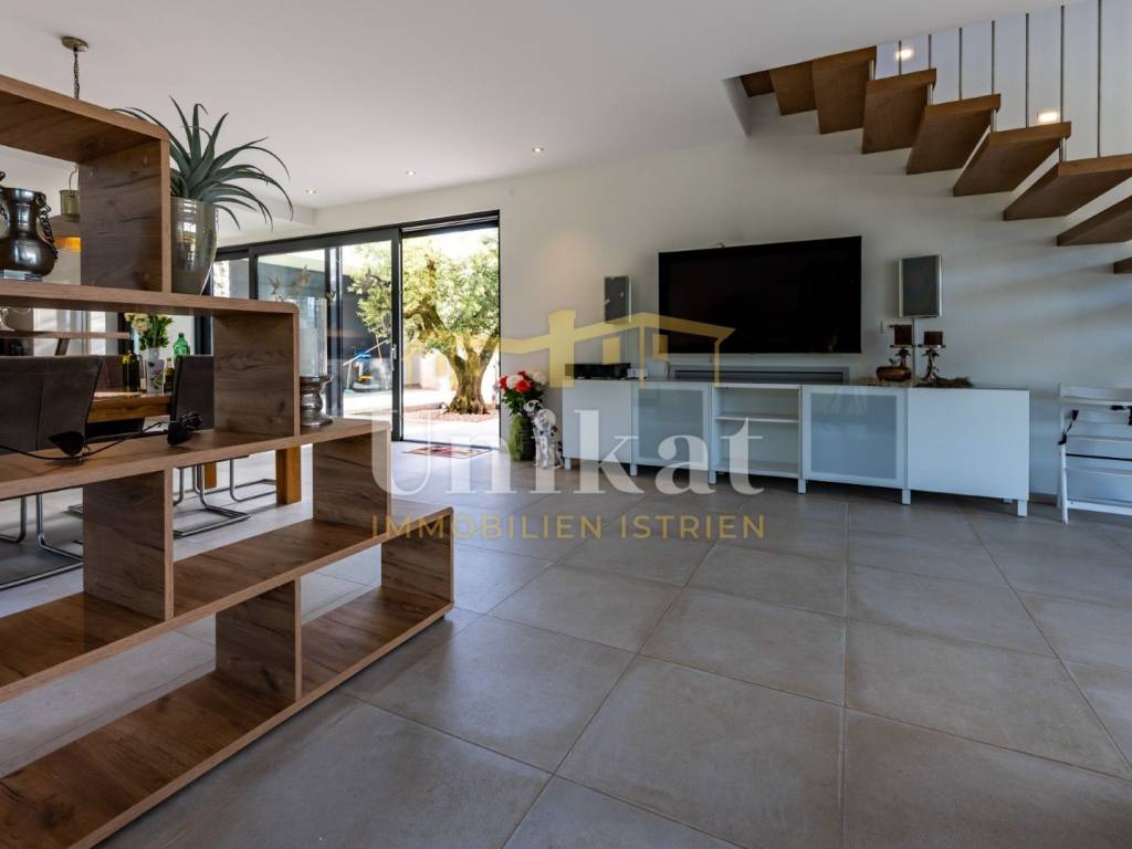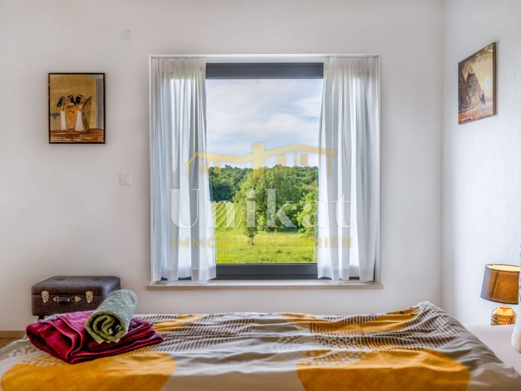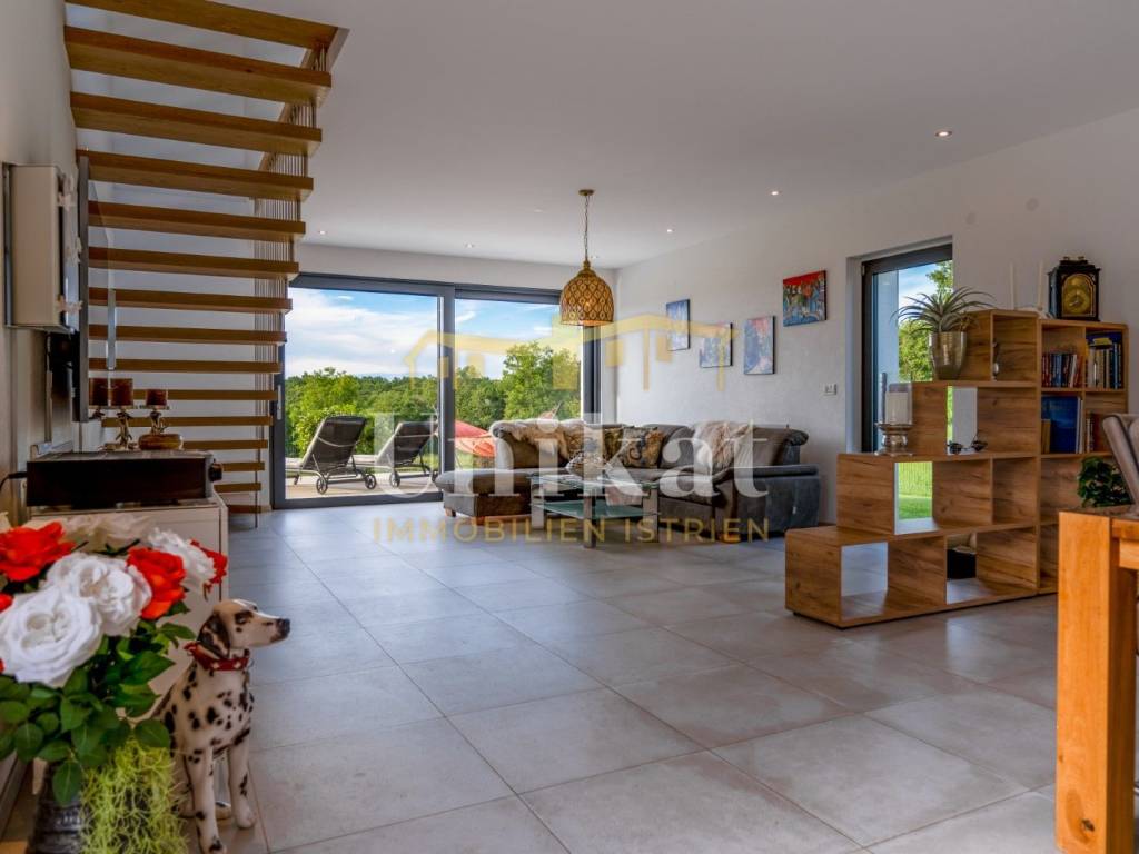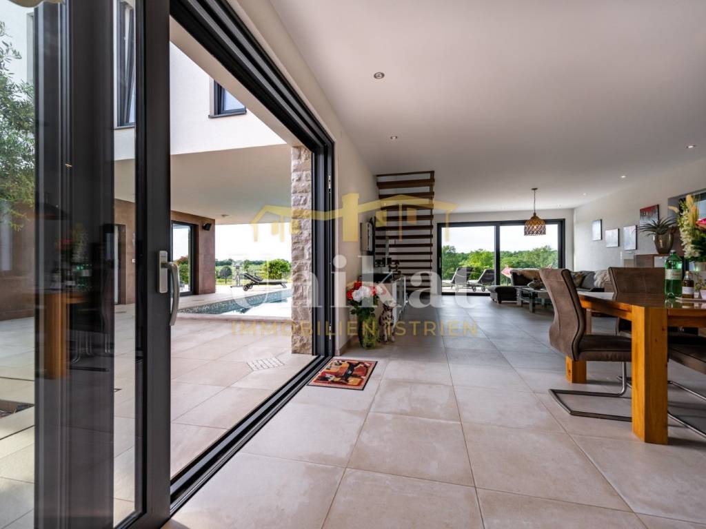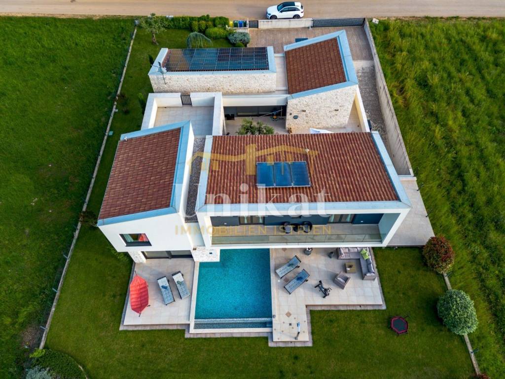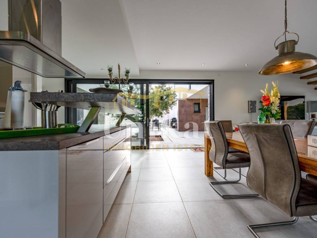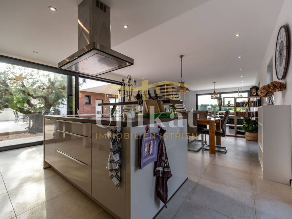 Ova luksuzna kuća nalazi se na periferiji Novigrada, 3 km od mora i centra grada. Susjedstvo je mirno i uredno te se sastoji od manjih stambenih zgrada, obiteljskih kuća i kuća za odmor. Budući da se kuća nalazi na rubu mjesta, vrlo je dobra privatnost, a sve je okruženo prirodom, vinogradima i maslinicima. Kuća se nalazi na kraju građevinske zone, na rubu šume.