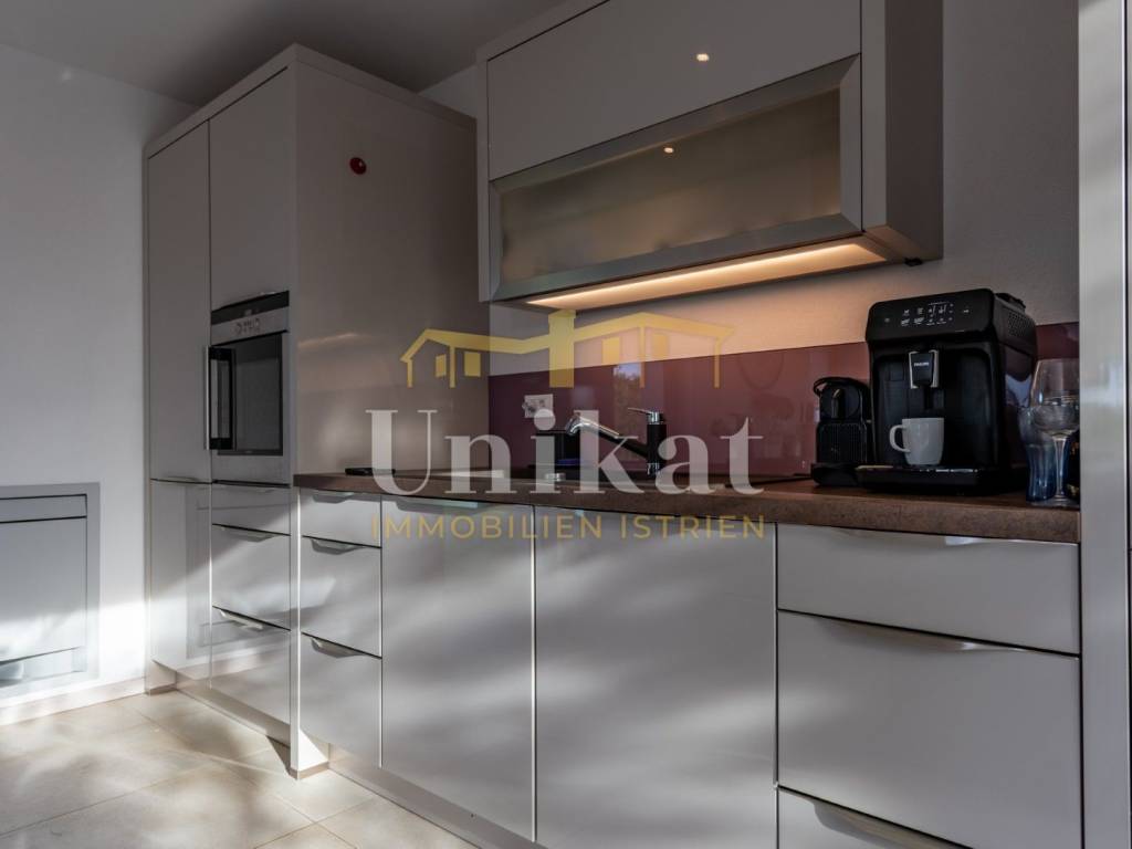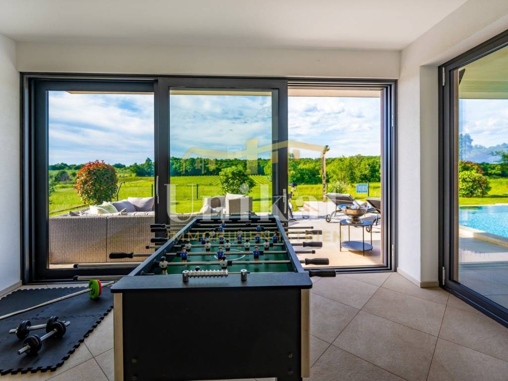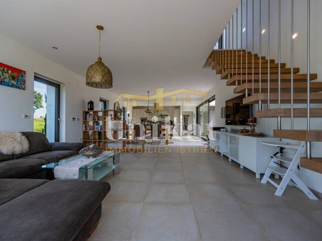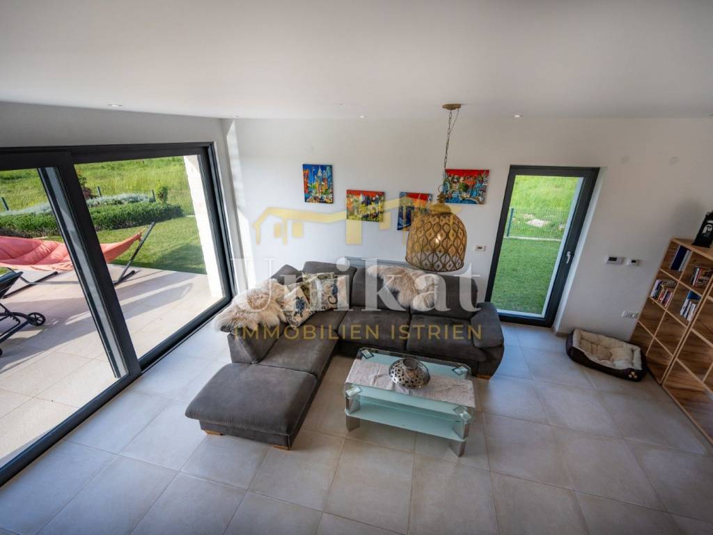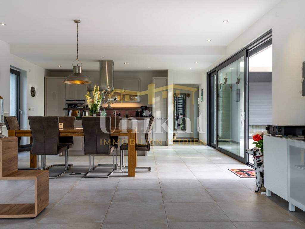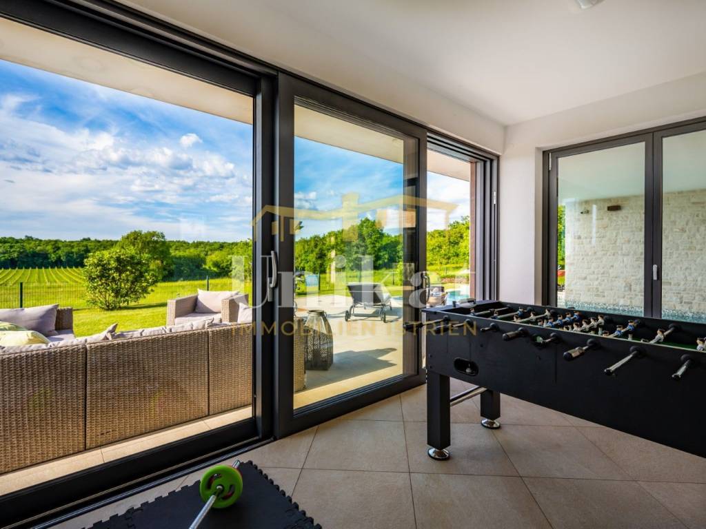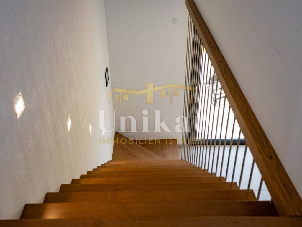 Ova luksuzna kuća nalazi se na periferiji Novigrada, 3 km od mora i centra grada. Susjedstvo je mirno i uredno te se sastoji od manjih stambenih zgrada, obiteljskih kuća i kuća za odmor. Budući da se kuća nalazi na rubu mjesta, vrlo je dobra privatnost, a sve je okruženo prirodom, vinogradima i maslinicima. Kuća se nalazi na kraju građevinske zone, na rubu šume.
