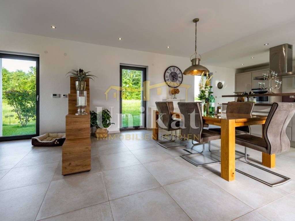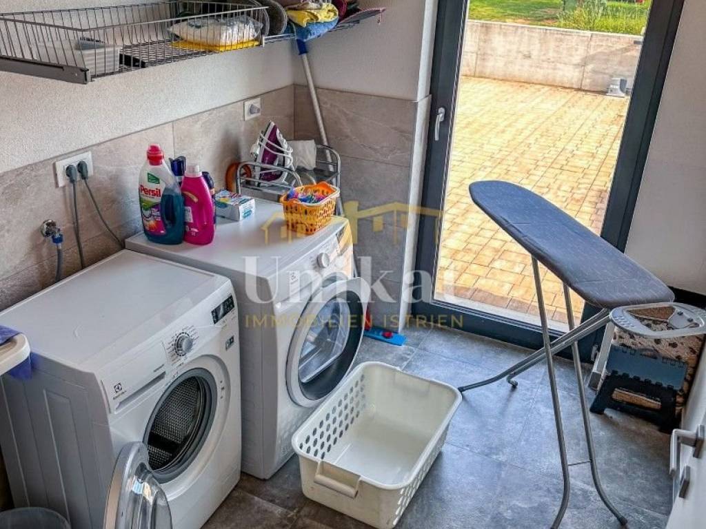 U prizemlju se nalaze vrlo prostran, otvoreni dnevni boravak s kuhinjom i blagovaonicom (65 m²), kao i gostinjski WC i praonica rublja.