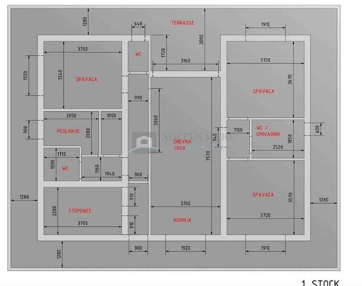 Sastoji se od: ulaz, hodnik, predsoblje, praonica, spremište, kuhinja i dnevni boravak sa blagovaonom, kupaona, tri spavaće sobe, kupaona 2 te toalet, izlaz na balkon i loggia.