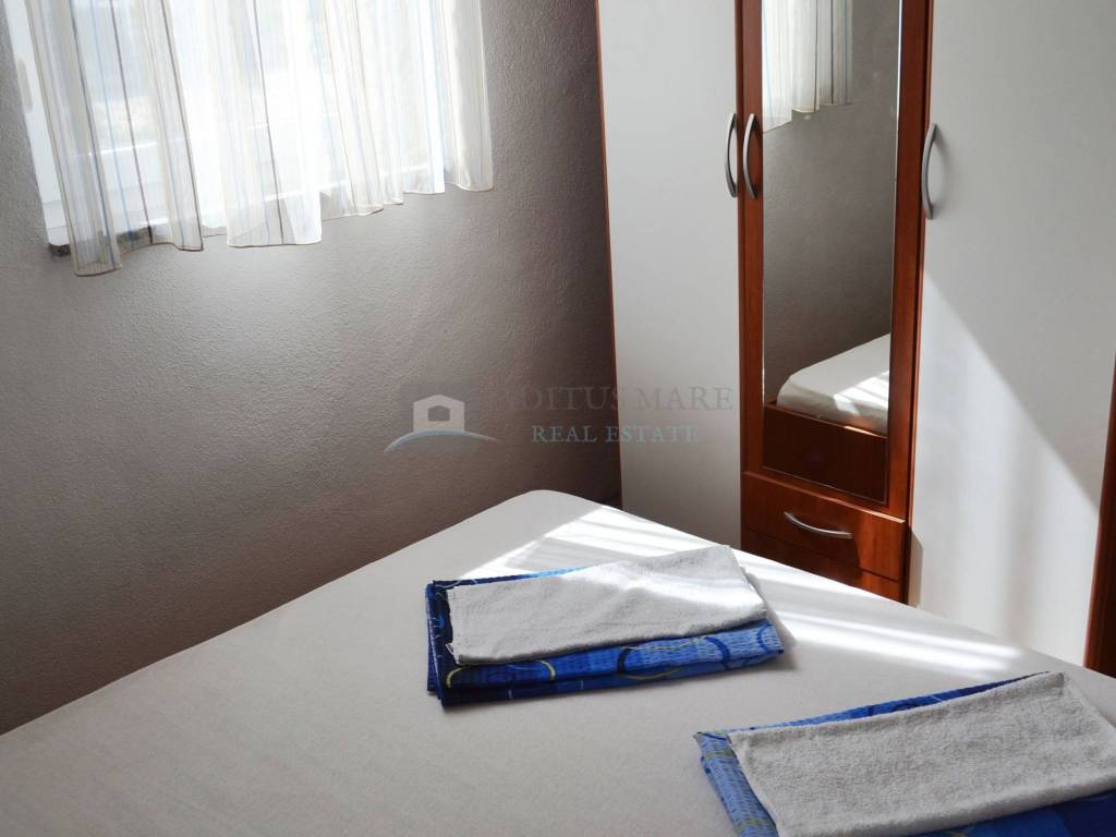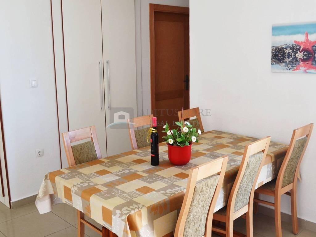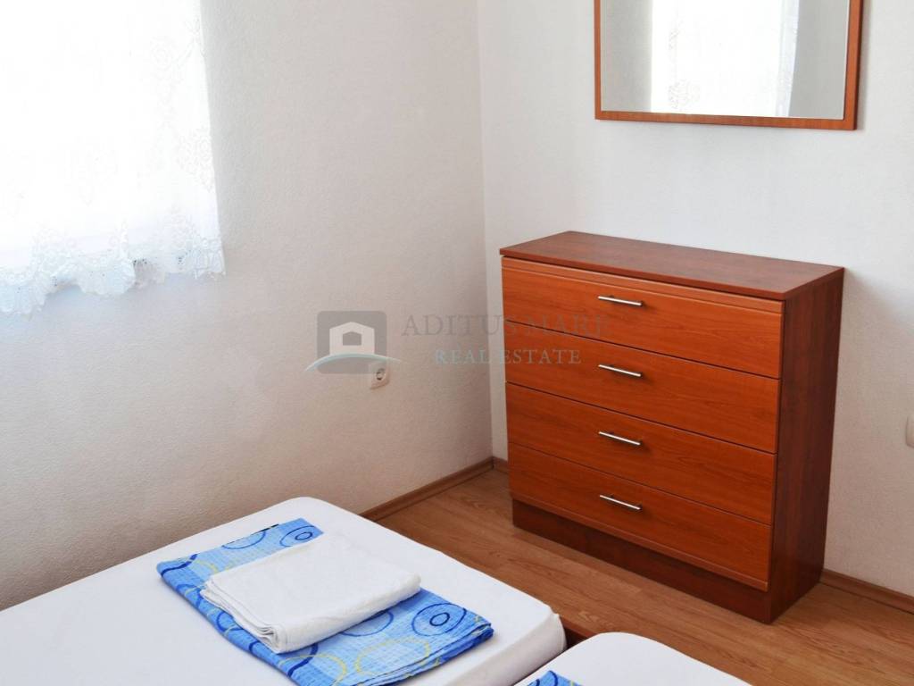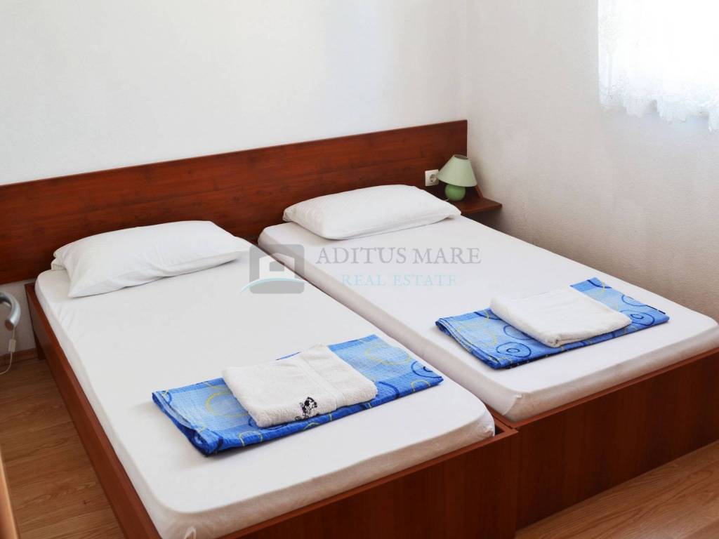 Prodaje se prostrana dvokatna kuća u Vodicama, novije gradnje. Kuća se sastoji od dva dvosobna i dva trosobna apartmana sa vlastitim kupaonicama, te velikim apartmanom na drugom katu. U svakom apartmanu nalazi se balkon i kupaonica koja mu pripada. Prostor dvorišta obogaćen je roštiljem i prikladan je za ljetne zabave. Ukupna površina je 1048.95 metara kvadratnih, a kuća je udaljena od centra Vodica cca. 1000 m, a od plaže cca. 600 m. Nalazi se na granici između Srime i Vodica stoga udaljenost od oba mjesta nije velika.