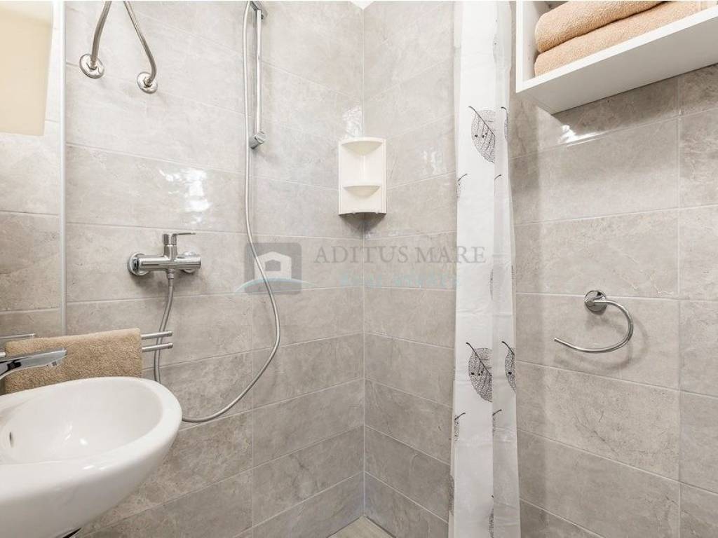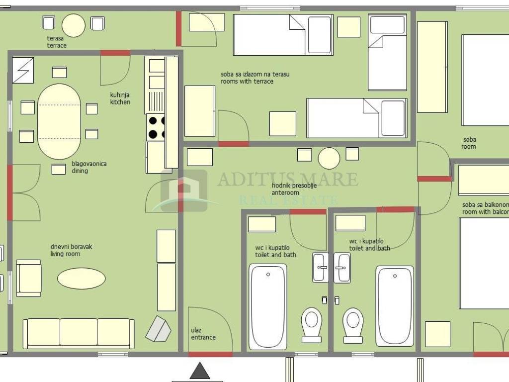 Na prvoj etaži se nalazi prostrani trosobni stan, s dvije kupaonice, kuhinjom s blagovaonicom i dnevnim boravkom, hodnikom te dvije terase. Južna terasa (izlaz iz dnevnog boravka i jedne od spavaćih soba) ima prekrasan pogled na more.