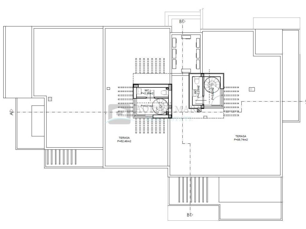 SJ8 - kuhinja, dnevni boravak i blagovaonica open space koncepta (34,75 m2), tri spava��e sobe, dvije kupaonice, toalet, spremi��te, tri terase ( 30,56 m2+ 17,82 m2+ 98,74 m2), parkirno mjesto