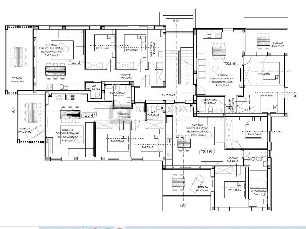 SJ 7 - kuhinja, dnevni boravak i blagovaonica open space koncepta (53,02 m2), tri spava��e sobe, dvije kupaonice, toalet, spremi��te, tri terase (25,22 m2+ 8,40 m2+ 62,48m2), parkirno mjesto