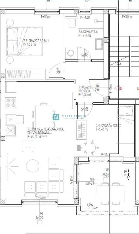 Stan S2 ukupne korisne površine 70 m2 (stambena površina 57,80 m2 + vrt 92 m2 + parking 15 m2) nalazi se u prizemlju. Stan funkcionalnog rasporeda sastoji se od ulaznog prostora, kupaonice, dvije spavaće sobe, kuhinje s blagovaonicom, dnevnog boravka koji ima izlaz na terasu i vrt površine 92 m2. Stanu pripada jedno parkirno mjesto. Cijena iznosi 200.000 € (Kupac je oslobođen plaćanja 3% poreza na promet nekretninama).
