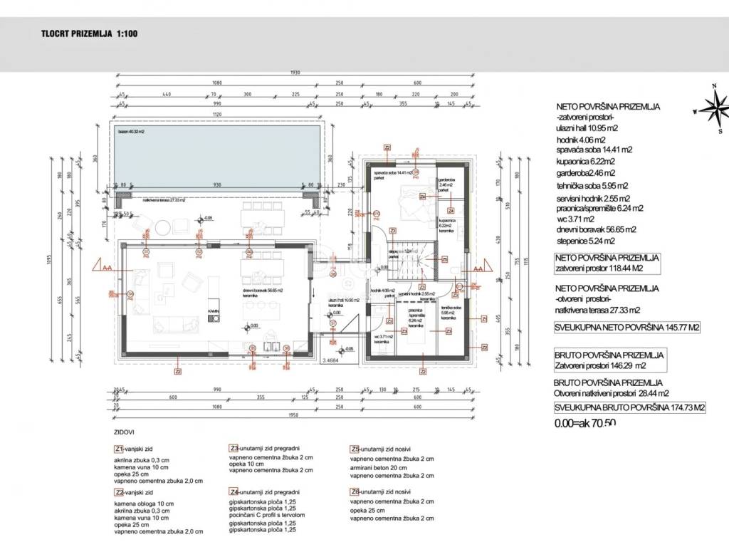 Prizemlje se sastoji od prostora otvorenog koncepta koji ujedinjuje dnevni boravak, blagovaonicu i kuhinju s izlazom na natkrivenu terasu, spavaće sobe s vlastitom kupaonicom i garderobom, gostinjskog toaleta, praonice rublja i tehničke prostorije.