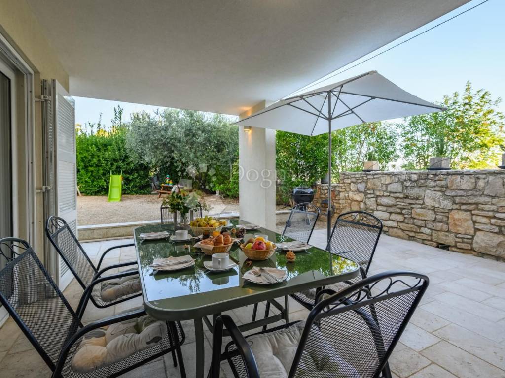 Ova impresivna vila nudi savršen spoj moderne udobnosti i mediteranskog života. Kroz prostrane, svijetle prostore i velike terase teče prirodna svjetlost, naglašavajući kvalitetan dizajn i materijale. Osim glavnih sadržaja, vila posjeduje dječje igralište, trampolinu, BBQ prostor i vlastiti parking, čineći je idealnom za cjelogodišnje korištenje. Njena lokacija u blizini svih sadržaja (market 500m, restoran 300m, aerodrom Pula 20km) čini je praktičnom i poželjnom.