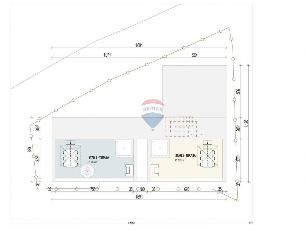 - treća etaža: krovna terasa 26.3 m2 s koje se pruža panoramski pogled na more