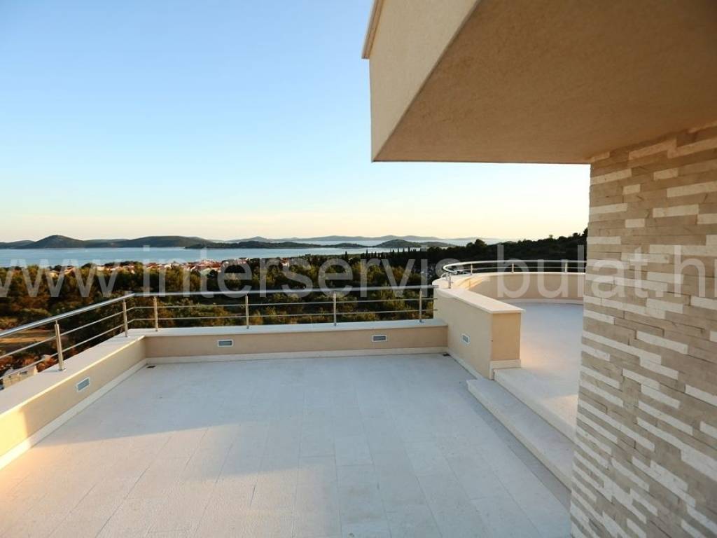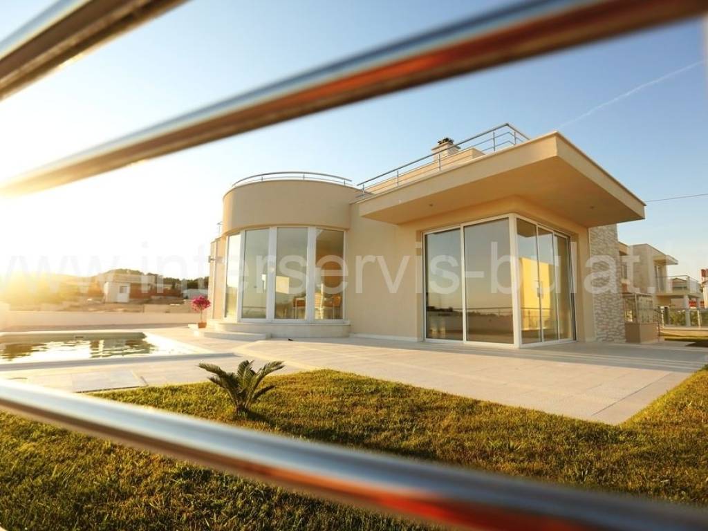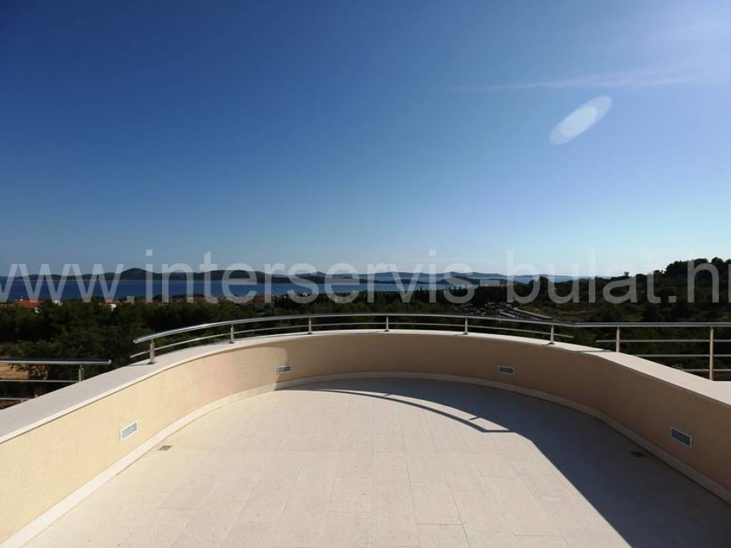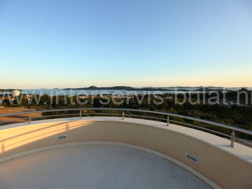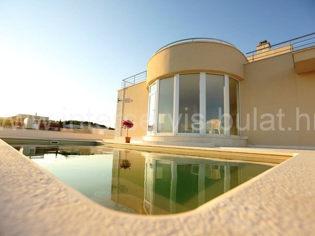 .::: Luksuzna vila s bazenom :::. Novoizgrađena vila u Vodicama smještena na povišenoj lokaciji omogućava prekrasan panoramski pogled na Vodice, Tribunj i more. Na parceli od 602m2 raspolaže s280m2 unutarnjeg luksuza. Moderna gradnja i vrhunski materijali zaštitni su znak ove samostojeće vile. U suterenu se nalazi apartman za goste dok komforno i prozračno prizemlje raspolaže s 3 sobe, 2 kupaonice, zasebnim toaletom, lijepom kuhinjom s blagovaonicom, ostavom i dnevnim boravkom. Vila ima prekrasnu terasu nesvakidašnjeg oblika i fenomenalnog pogleda. Ispred se nalazi lijep bazen od 27m2 s decentno uređenom okućnicom. Impresivna krovna terasa od 120m2 omogućuje nezaboravne zalaske sunca. Vila opremljena s top materijalima i tehnologijom pruža nesvakidašnji luksuz. Od materijala su korišteni granit i mramor, podno grijanje na toplinsku pumpu i centralni klima uređaj omogućuju tijekom cijele godine optimalnu temperaturu u cijeloj vili. Obilazak nekretnine moguć je uz prethodni dogovor i rezervaciju termina (minimalno dva dana unaprijed). Molimo pri telefonskom kontaktu obavezno navesti šifru objekta (ID nekretnine). Radujemo se Vašem pozivu.