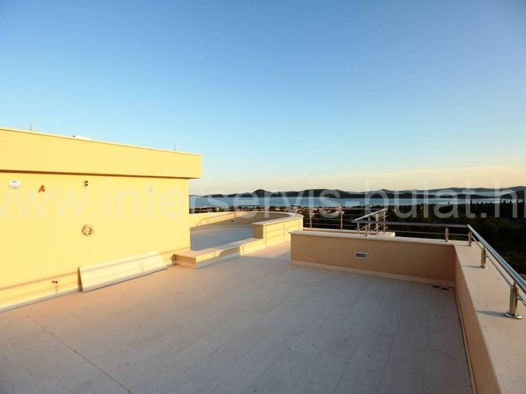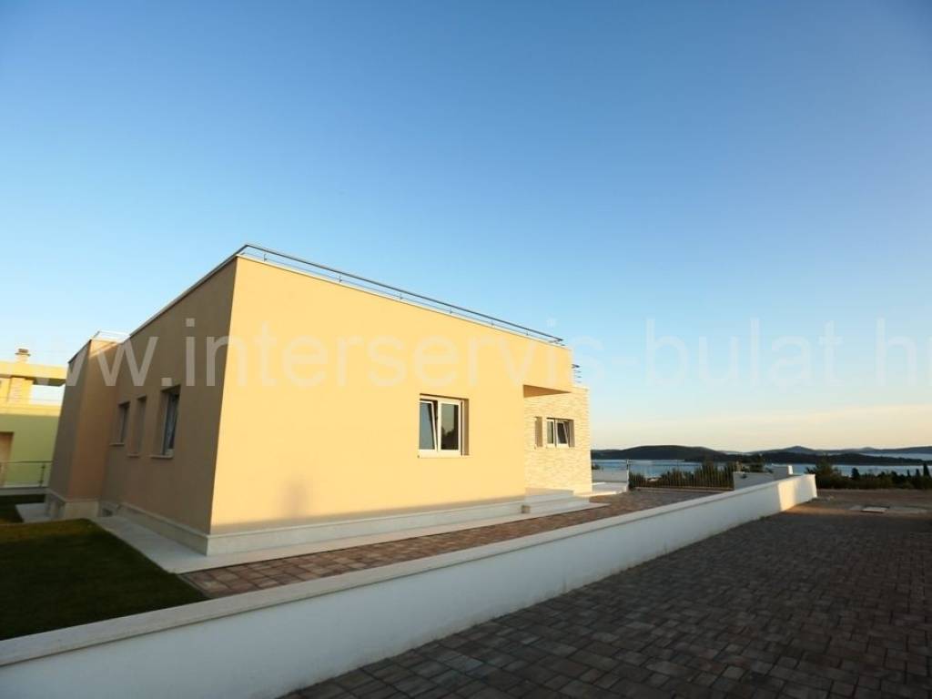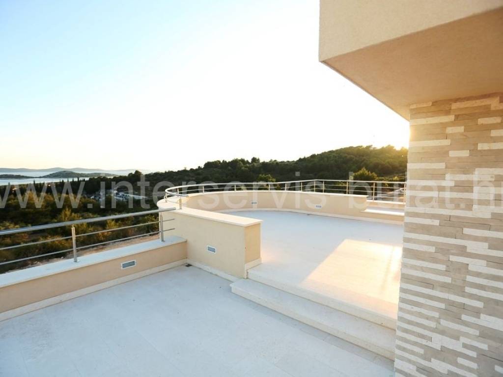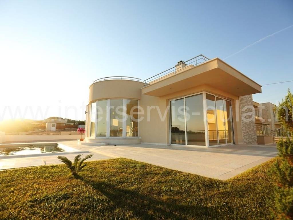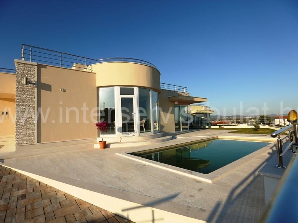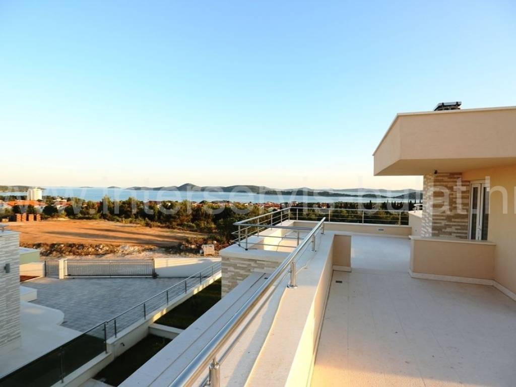 .::: Luksuzna vila s bazenom :::. Novoizgrađena vila u Vodicama smještena na povišenoj lokaciji omogućava prekrasan panoramski pogled na Vodice, Tribunj i more. Na parceli od 602m2 raspolaže s280m2 unutarnjeg luksuza. Moderna gradnja i vrhunski materijali zaštitni su znak ove samostojeće vile. U suterenu se nalazi apartman za goste dok komforno i prozračno prizemlje raspolaže s 3 sobe, 2 kupaonice, zasebnim toaletom, lijepom kuhinjom s blagovaonicom, ostavom i dnevnim boravkom. Vila ima prekrasnu terasu nesvakidašnjeg oblika i fenomenalnog pogleda. Ispred se nalazi lijep bazen od 27m2 s decentno uređenom okućnicom. Impresivna krovna terasa od 120m2 omogućuje nezaboravne zalaske sunca. Vila opremljena s top materijalima i tehnologijom pruža nesvakidašnji luksuz. Od materijala su korišteni granit i mramor, podno grijanje na toplinsku pumpu i centralni klima uređaj omogućuju tijekom cijele godine optimalnu temperaturu u cijeloj vili. Obilazak nekretnine moguć je uz prethodni dogovor i rezervaciju termina (minimalno dva dana unaprijed). Molimo pri telefonskom kontaktu obavezno navesti šifru objekta (ID nekretnine). Radujemo se Vašem pozivu.