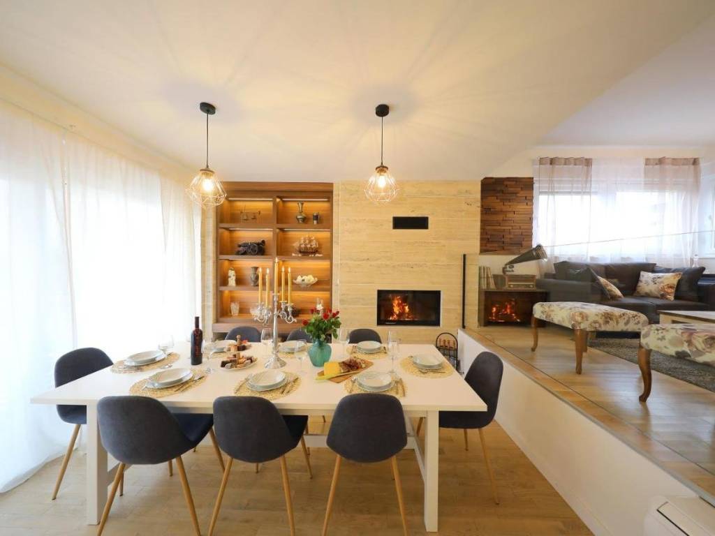 Stan je opremljen vrhunskom stolarijom, sustavom klimatizacije putem pet klima jedinica te elegantnim i funkcionalnim kaminom za ugodan ambijent i zimi. Dodatnu vrijednost pružaju dva privatna parkirna mjesta i uređeni pristupni prostor.