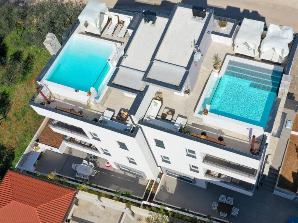 Ono što ovu nekretninu čini posebnom je impozantna krovna terasa s grijanim privatnim bazenom, prostorom za sunčanje i potpunom privatnošću. Idealna je za opuštanje, druženja ili turistički najam — uz neometane poglede i orijentaciju koja osigurava sunce tijekom cijelog dana.