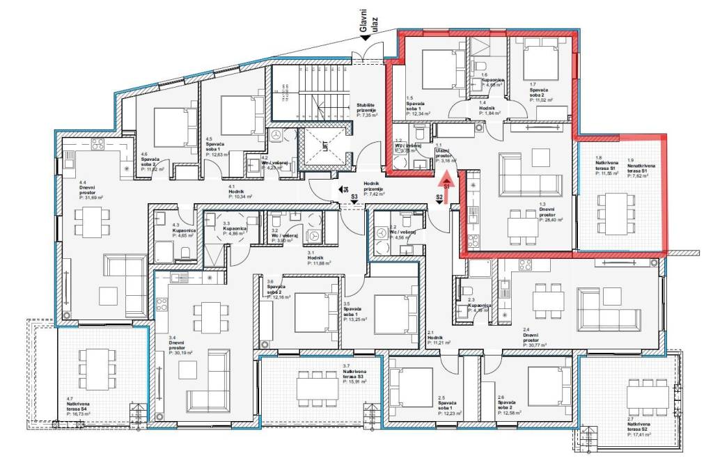 Stan S7 na I. katu ukupne površine 125,48 m2 sastoji se od ulaza, hodnika, vešeraja, kupaonice 1, dvije spavaće sobe, spavaće sobe s vlastitom kupaonicom 2, kuhinje s blagovaonicom i dnevnog boravka te natkrivene terase površine 21,52 m2. Stanu pripada ostava u podrumu i jedno parkirno mjesto.