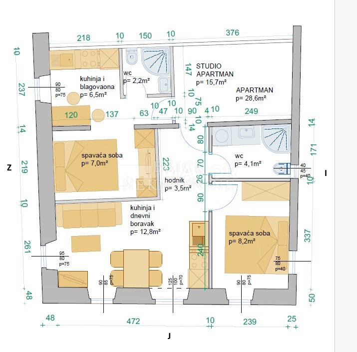 kao jedna cjelina: studio apartman površine 16 m i stan od 30 m. Smješteni su na trećem katu uredne