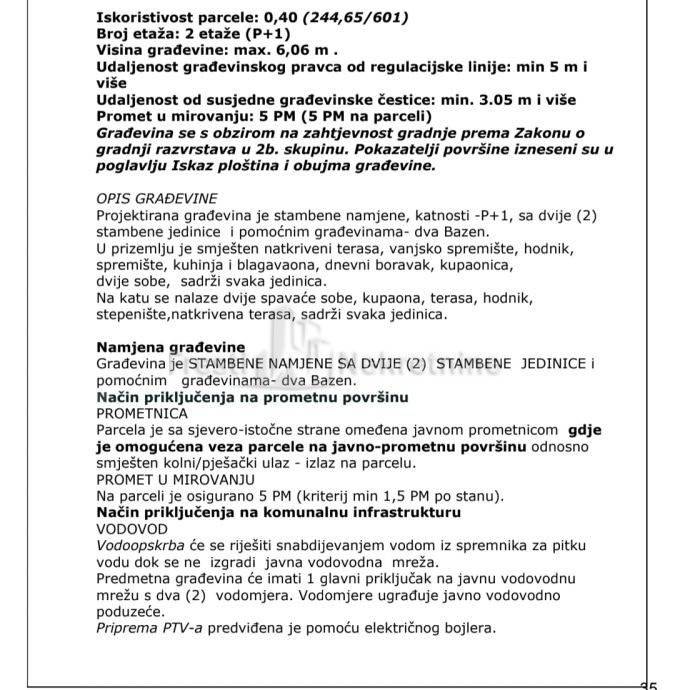 Projektirana građevina je stambene namjene, katnosti -P+1, sa dvije (2)stambene jedinice i pomoćnim građevinama- dva bazena.