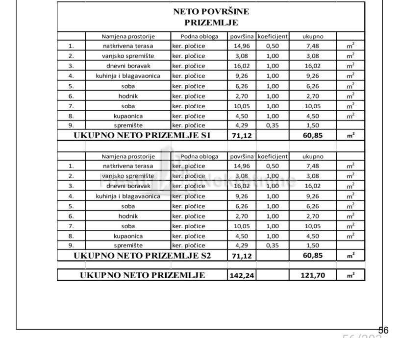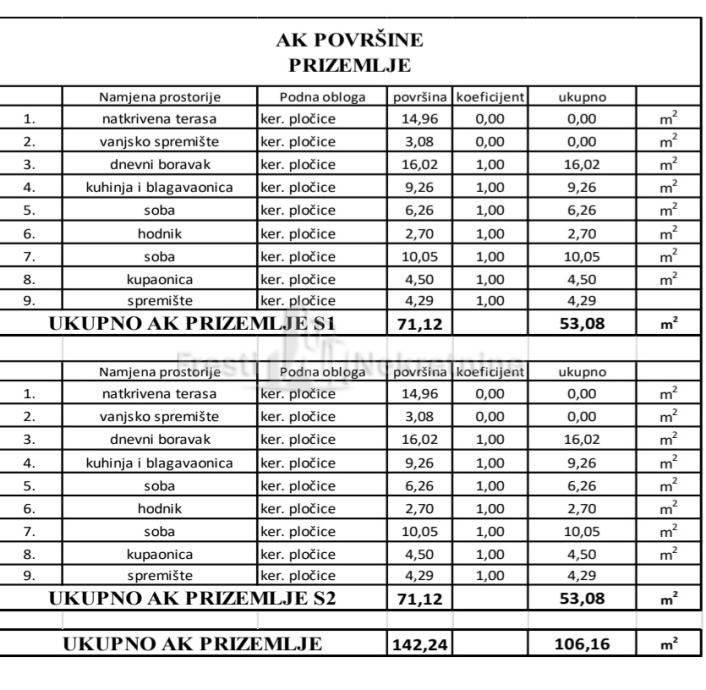 U prizemlju je smještena natkriveni terasa, vanjsko spremište, hodnik,spremište, kuhinja i blagavaonica, dnevni boravak, kupaonica,dvije sobe, sadrži svaka jedinica.