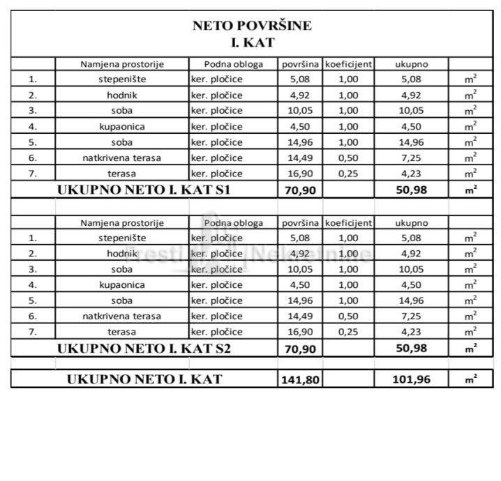 Na katu se nalaze dvije spavaće sobe, kupaonica, terasa, hodnik,stepenice,natkrivena terasa, sadrži svaka jedinica.