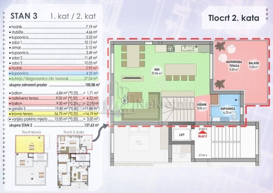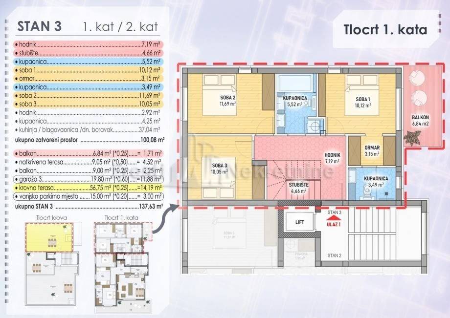 Ukupna neto zatvorena površina stana bez pripadaka 100.08 m2, a s pripatcima ukupna prodajna površina nakon obračuna pripadaka po koeficijentima je 137.63 m2. Bruto zbrojena ukupna površina stana i pripadaka je 216.52m2