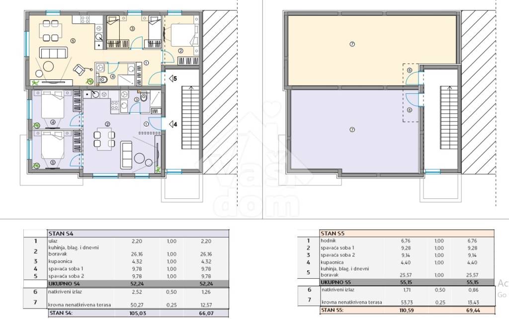 Na odličnoj lokaciji u Bibinju svega 250 m od mora, prodaje se stan na drugom katu sa prekrasnim pogledom na more oznake "S5" i parkirnim mjestom. Stan je veličine 55,15 m2 + terasa s natkrivenim izlazom na krovu 55,44 m2 , s jednim parkirnim mjestom cca 15 m2 koje nije u cijeni ni kvadraturi sve zajedno obračunski 72,24 m2. U jednoj zgradi se nalazi 5 stanova od kojih su dva u prizemlju jedan na katu i dva na 2. katu. Stan se sastoji od dvije podjednake spavaće sobe s prekrasnim pogledom, hodnika, kupaonice, kuhinje i prostrane dijela s kuhinjom blagovaonicom i dnevnim boravkom punim svijetla. Opremljenost stanova: