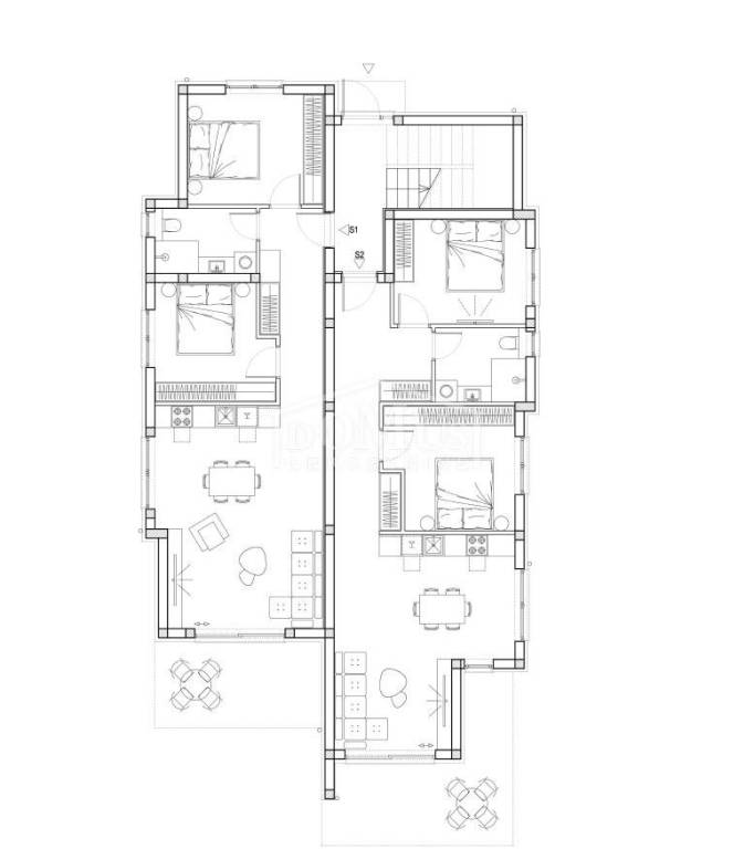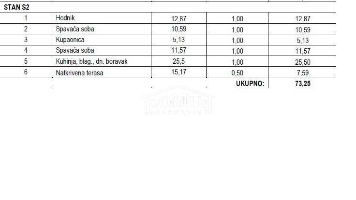 Apartman se nalazi u prizemlju novoizgrađene zgrade i sastoji se od hodnika, kupaonice, dvije spavaće sobe, kuhinje s blagovaonicom i dnevnog boravka u jednoj cjelini, s izlazom na veliku natkrivenu terasu površine 15,17 m².