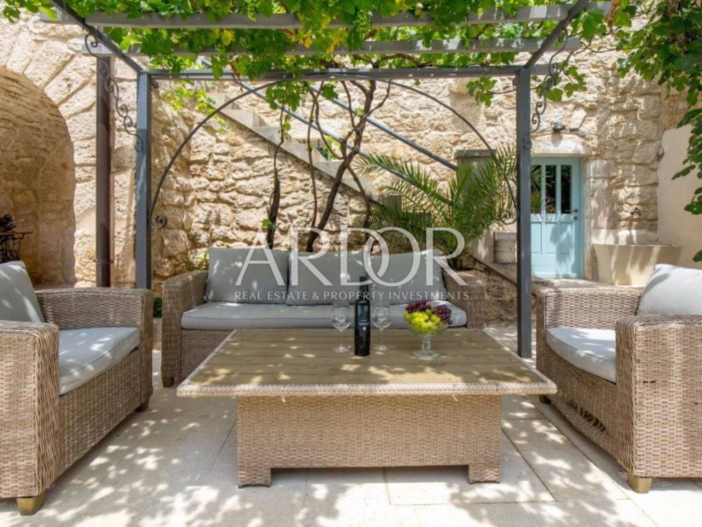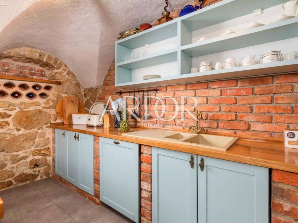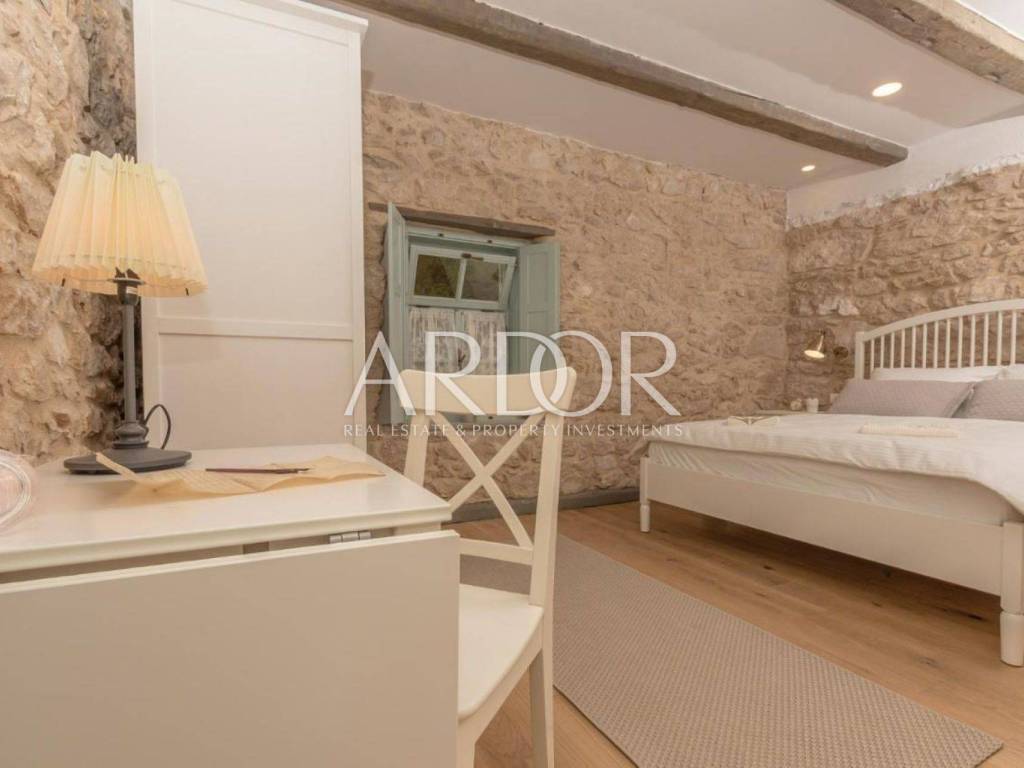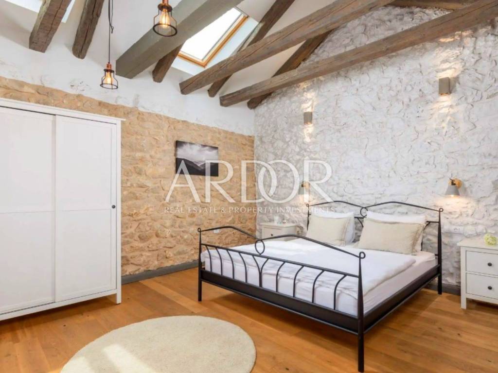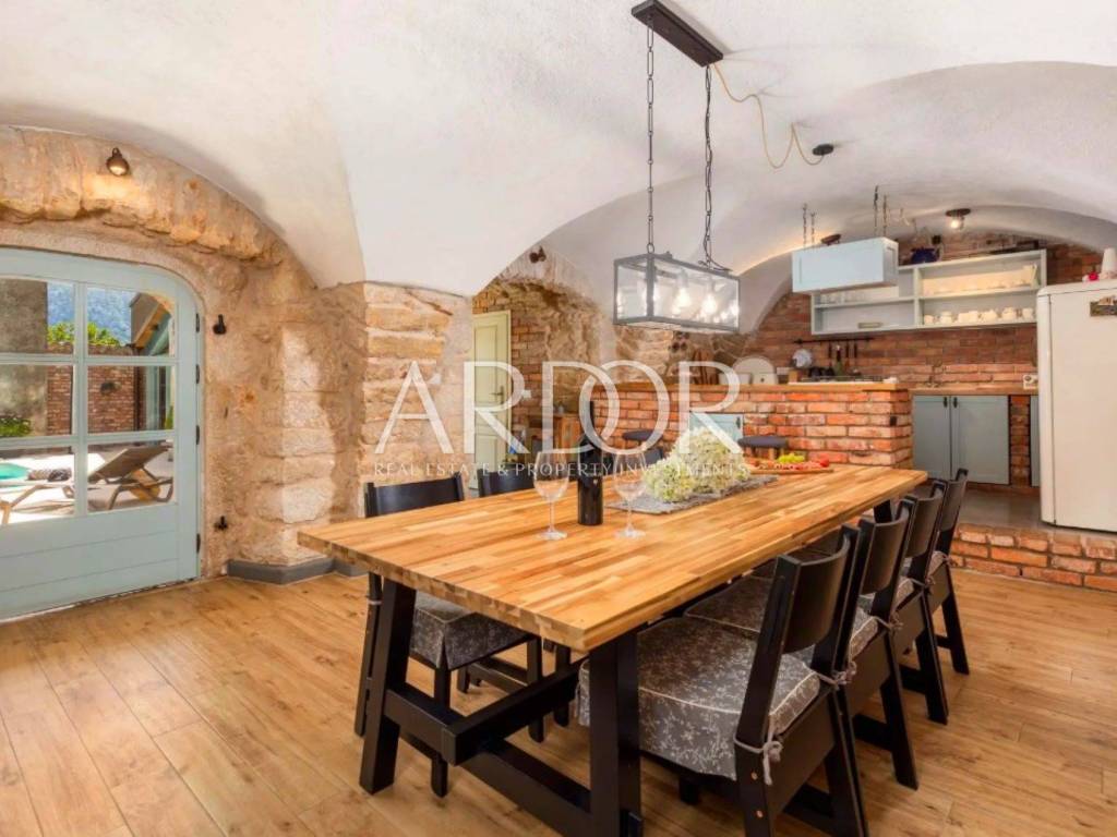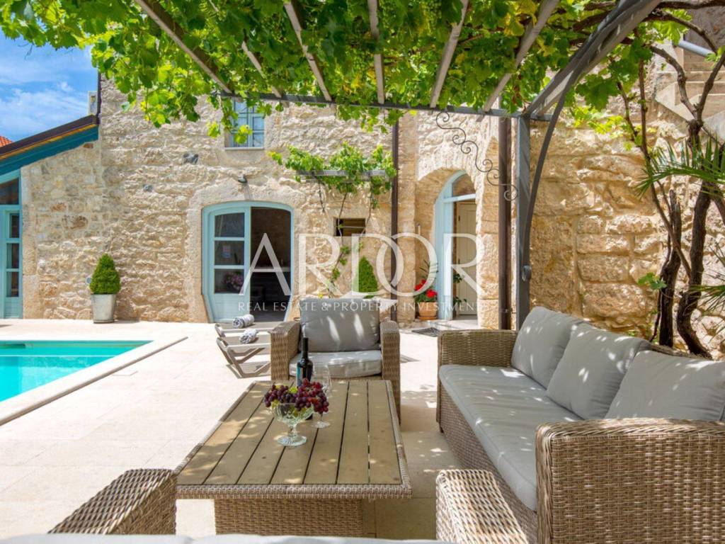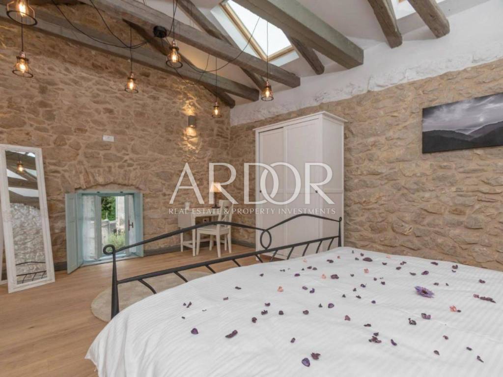 Ova prekrasna kamena kuća oduševljava skladnim spojem rustikalnog šarma i suvremenog dizajna, stvarajući ambijent u kojem se elegancija susreće s udobnošću. Posebnu čar daje privatni bazen smješten u ograđenom dvorištu, okružen kamenim zidovima koji pružaju potpunu privatnost i autentičan mediteranski ugođaj.