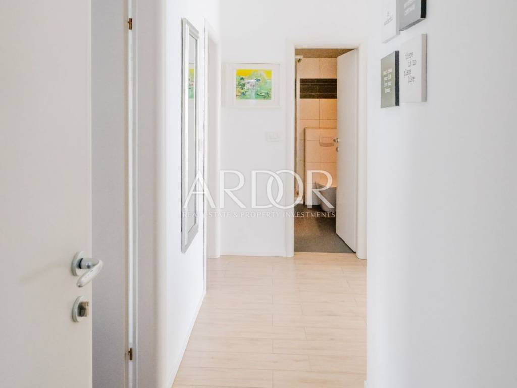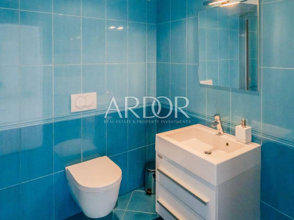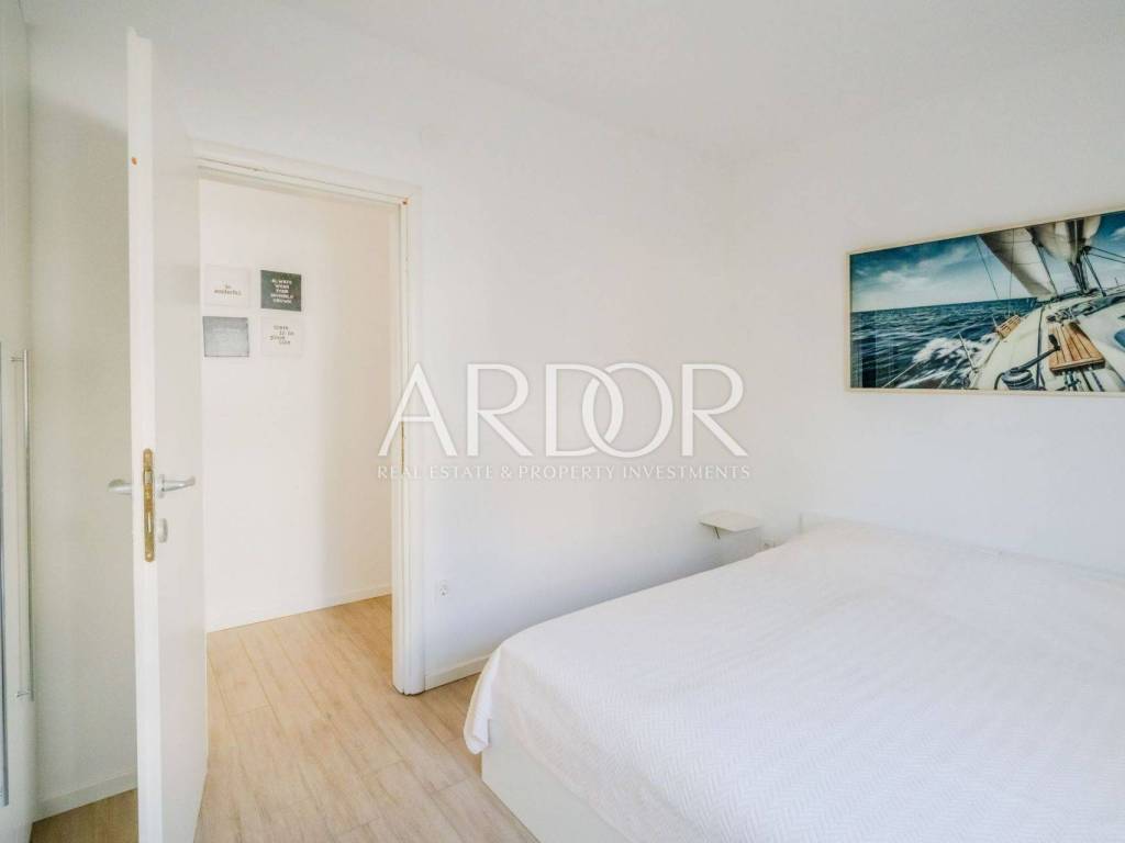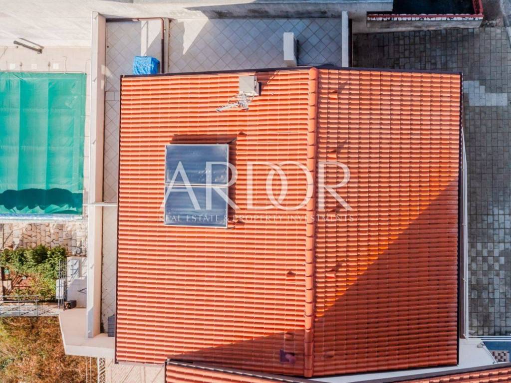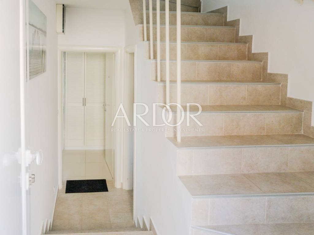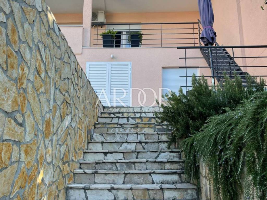 Na prvom katu nalazi se dodatni stambeni prostor s dnevnim boravkom, kuhinjom i blagovaonicom, dvije spavaće sobe, kupaonicom, predsobljem i ostavom. Balkon s pogledom na more i montažne stepenice koje vode prema terasi i vrtu dodatno povećavaju praktičnost i funkcionalnost prostora.