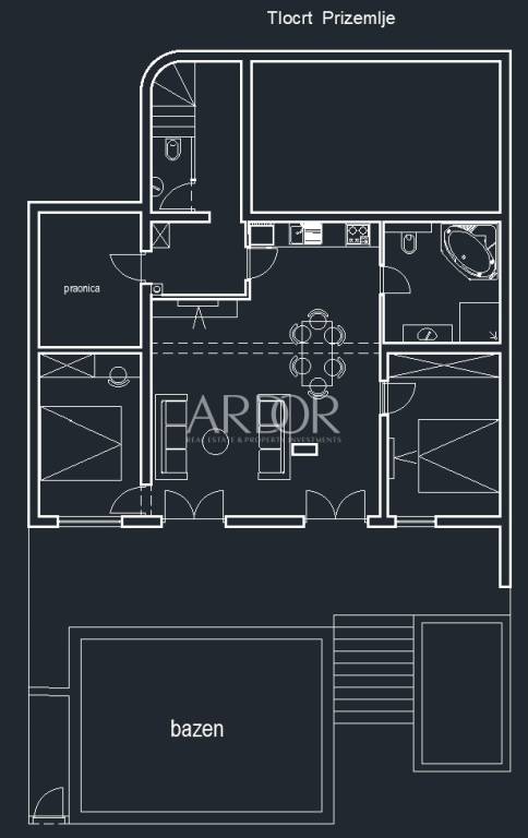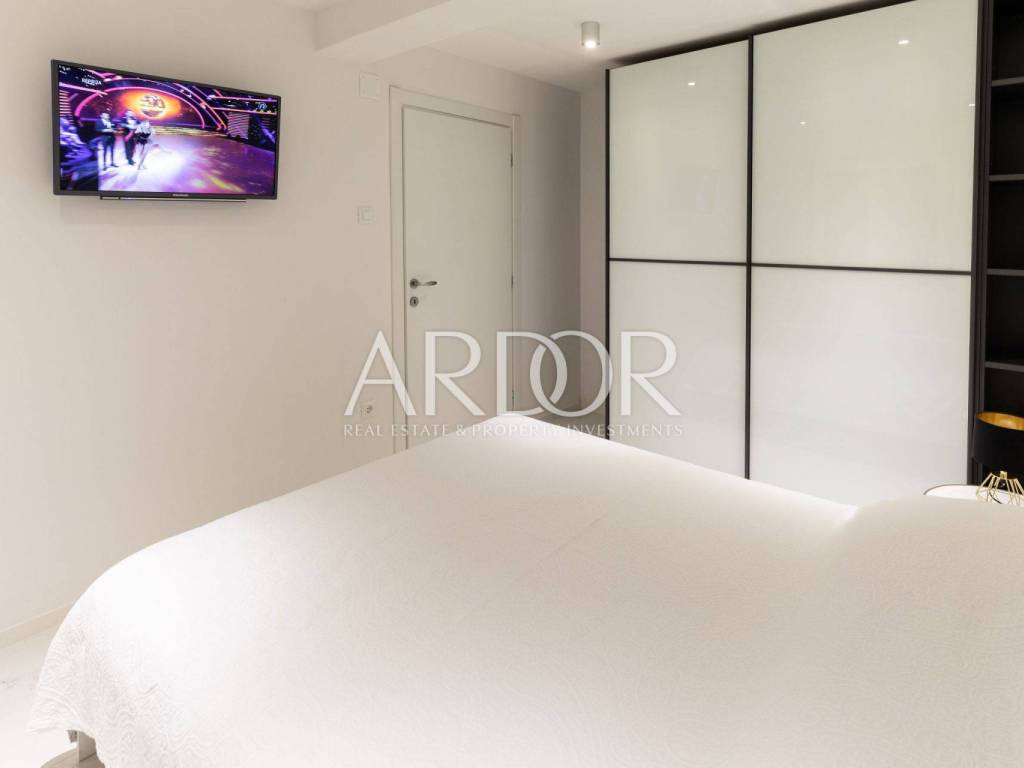 Prizemlje sadrži dvije spavaće sobe, kupaonicu, dnevni boravak povezan s kuhinjom i blagovaonicom, hodnik, dodatni toalet, kotlovnicu i praonicu. Iz dnevnog dijela izlazi se na terasu s grijanim bazenom, dok uređeni vrt s mini vanjskom kuhinjom nudi prostor za opuštanje i druženje uz otvoren pogled na more.
