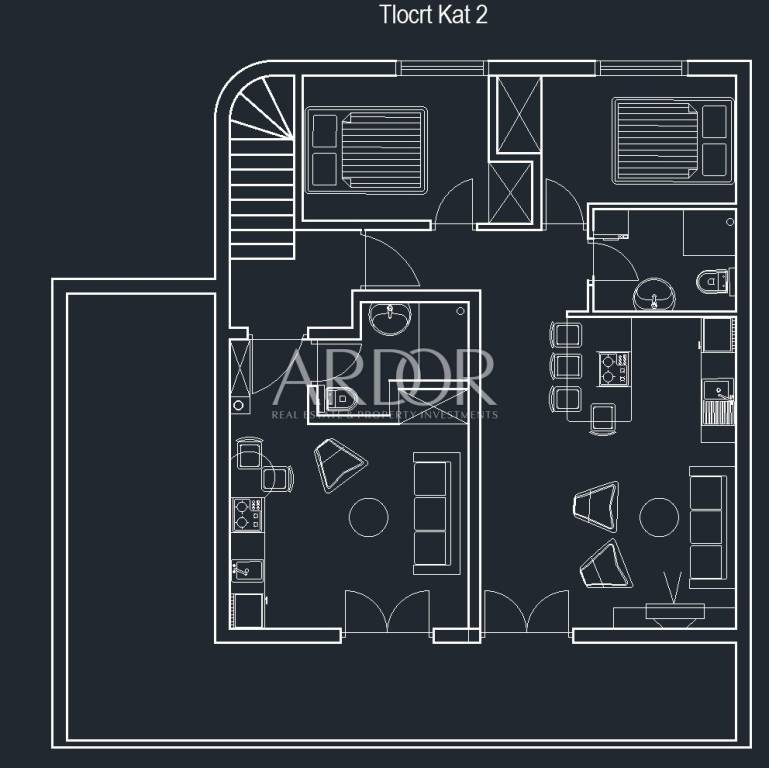 Drugi kat obuhvaća garsonijeru i dodatni stan, obje jedinice s vlastitim balkonima i otvorenim pogledom na more. Stan se sastoji od dnevnog boravka s kuhinjom i blagovaonicom, dvije spavaće sobe, kupaonice i hodnika.