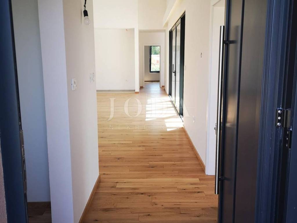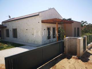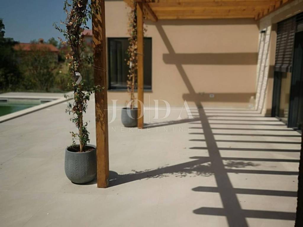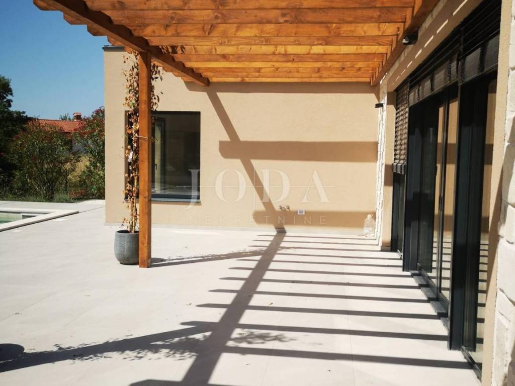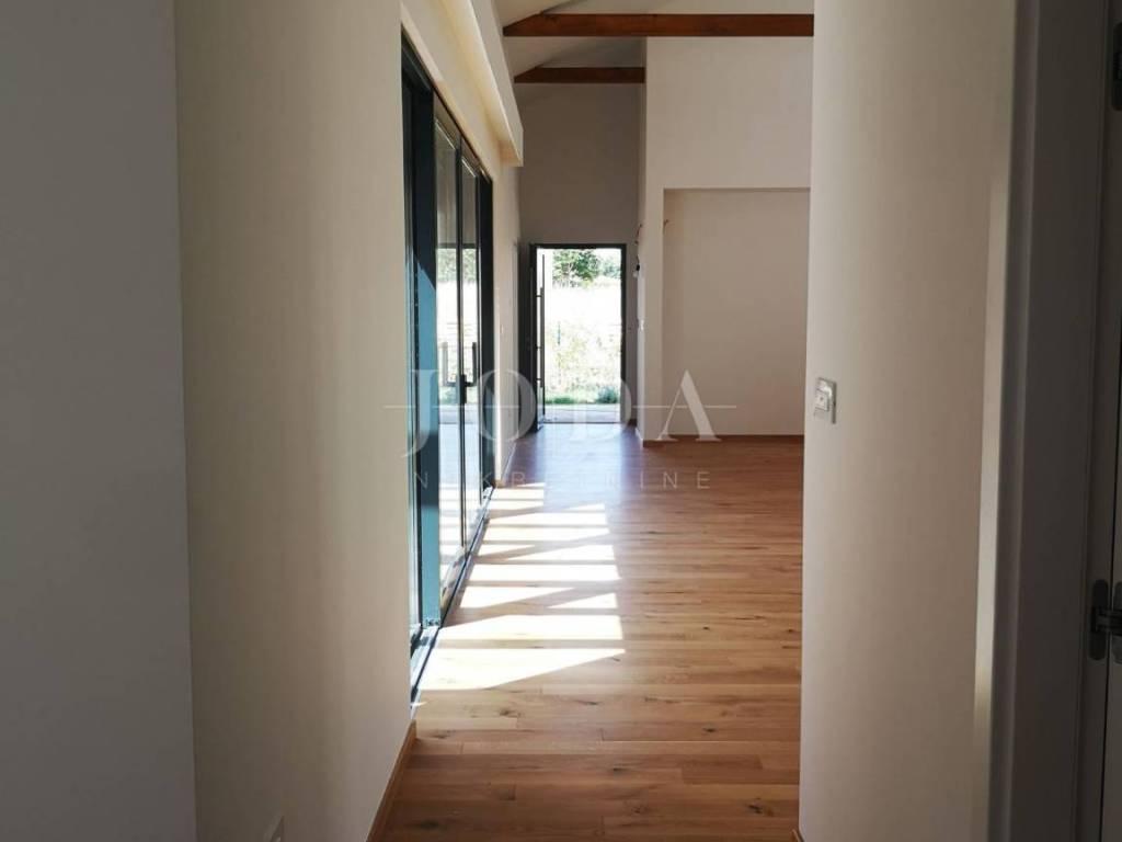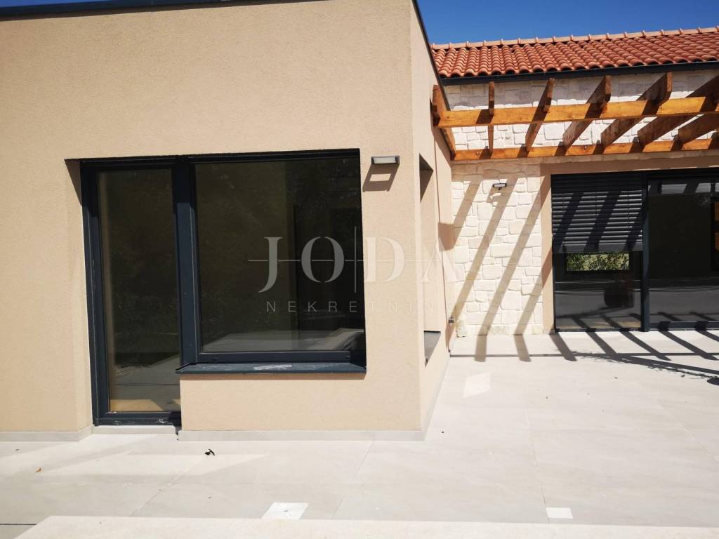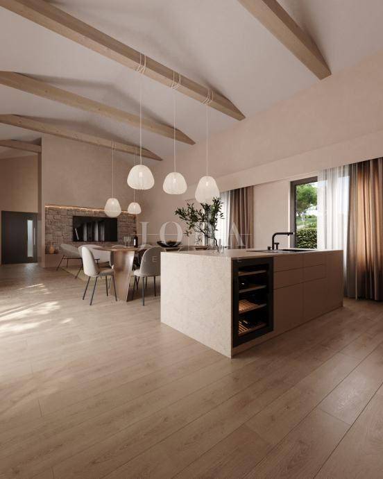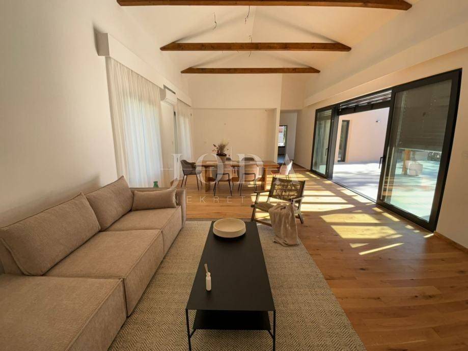 Kuća ima veliki dvostrano osunčani i prozračni dnevni boravak,visok strop sa dekorativnim drvenim gredama te kuhinja i blagovaonica otvorenog tipa,velike staklene stijene vode na prostranu terasu sa pergolom te grijani bazenom i sunčalište okruženo zelenilom.