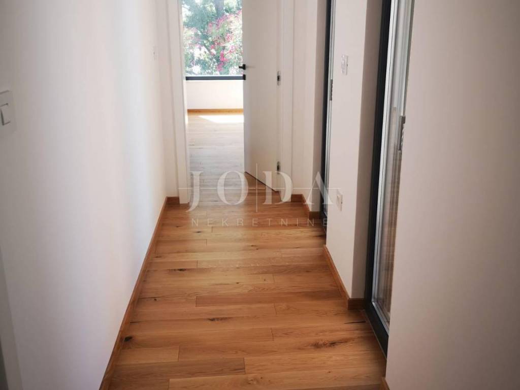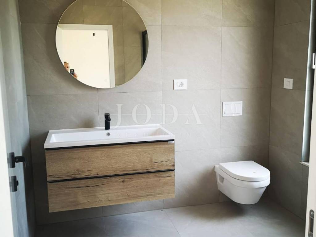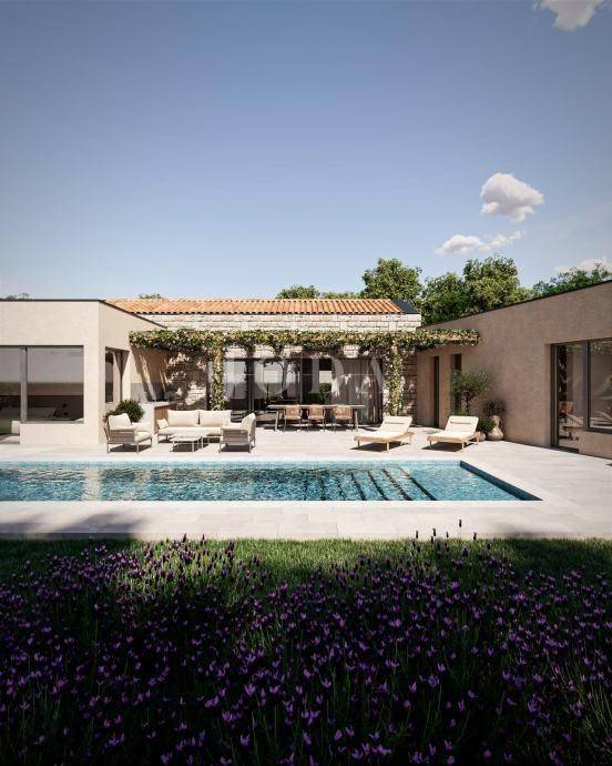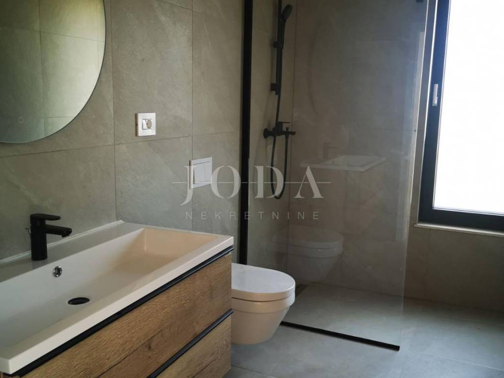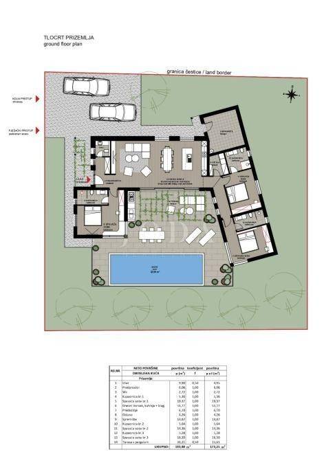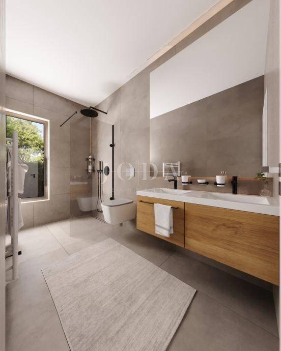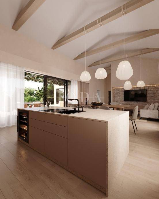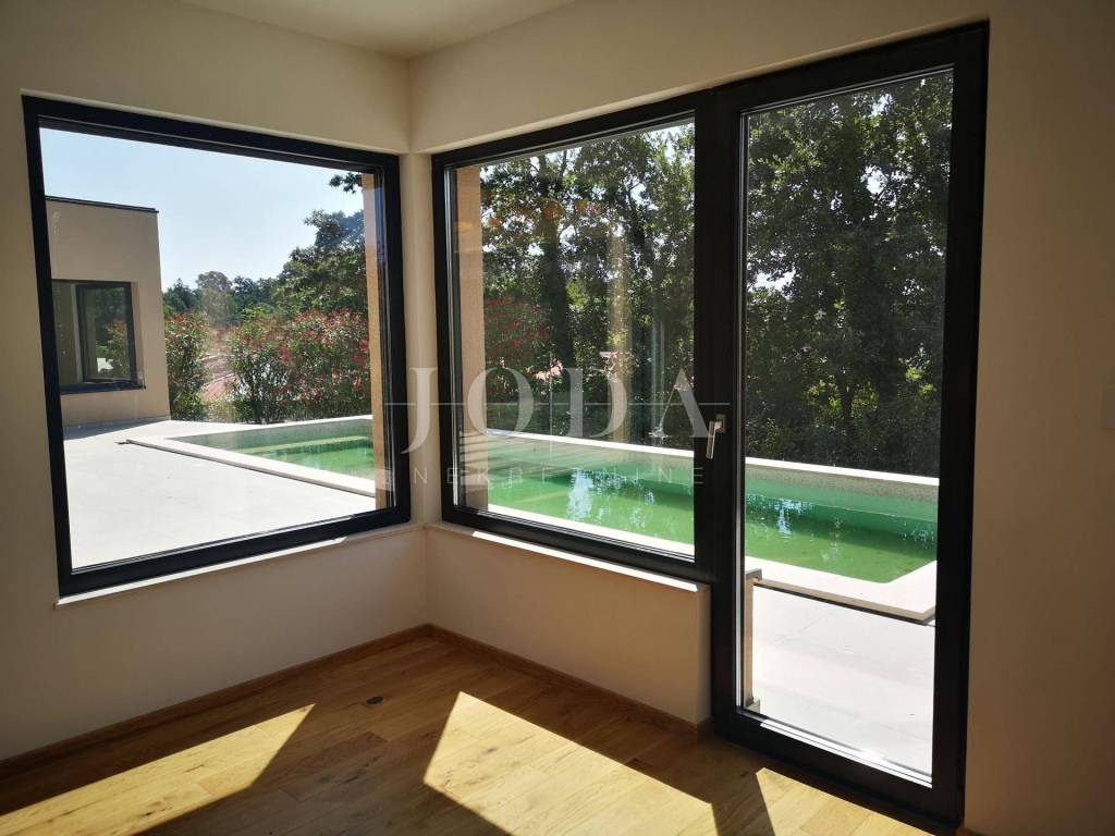 Kuća ima veliki dvostrano osunčani i prozračni dnevni boravak,visok strop sa dekorativnim drvenim gredama te kuhinja i blagovaonica otvorenog tipa,velike staklene stijene vode na prostranu terasu sa pergolom te grijani bazenom i sunčalište okruženo zelenilom.