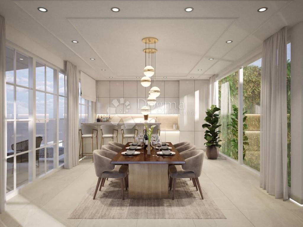 Stan raspolaže s 173 m neto korisne površine, raspoređene na dvije etaže, uz iznimno velik vanjski prostor koji mu daje karakter privatne rezidencije. Donja etaža organizirana je oko prostranog dnevnog boravka povezanog s kuhinjom i blagovaonicom, dok je privatni dio stana jasno odvojen i obuhvaća tri spavaće sobe te dvije kupaonice.