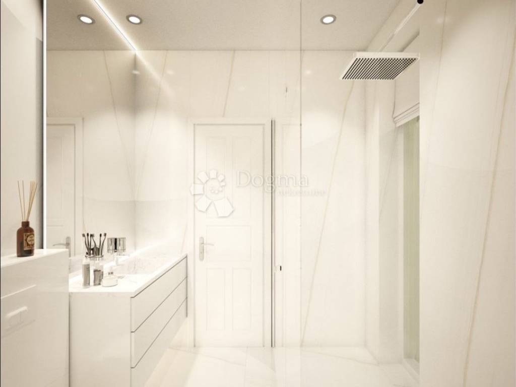 Dnevni boravak ima direktan izlaz na natkrivenu terasu i tri privatna vrta, čime se ostvaruje rijetka kombinacija komfora stana i kvalitete vanjskog prostora karakterističnog za samostojeću kuću.