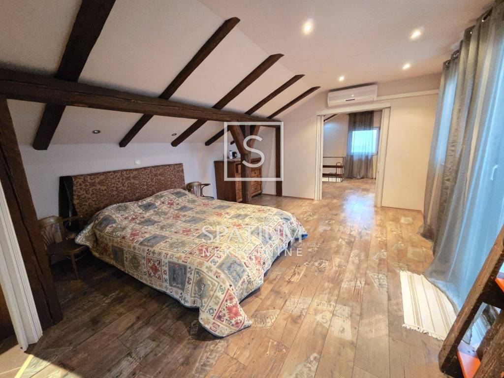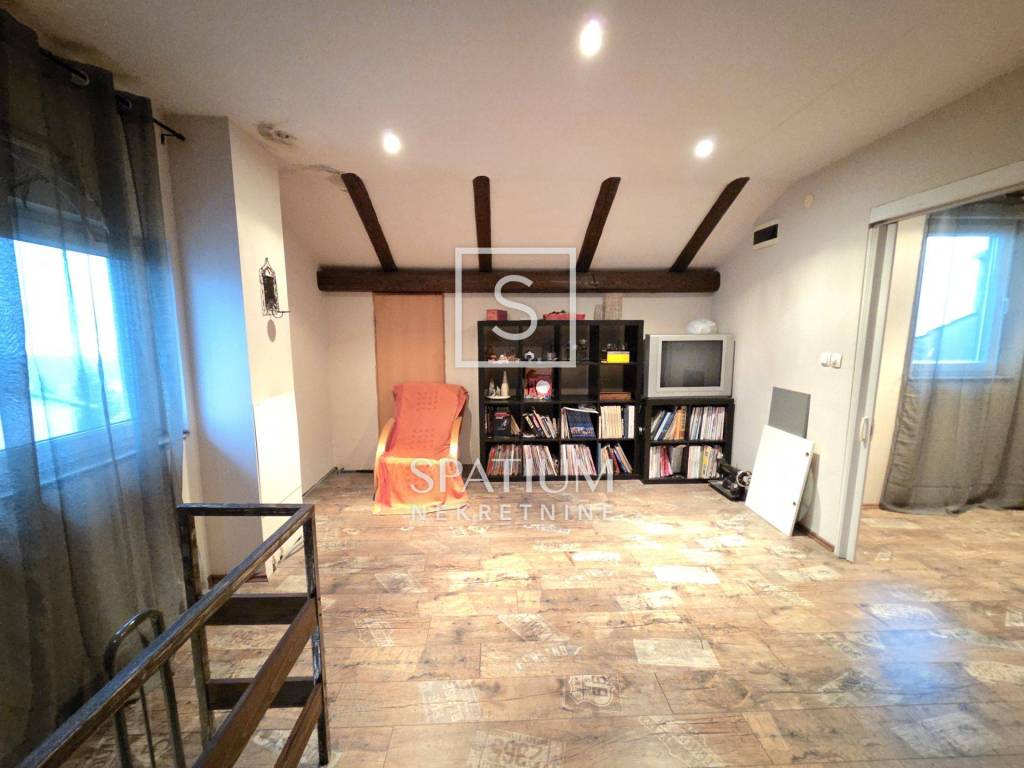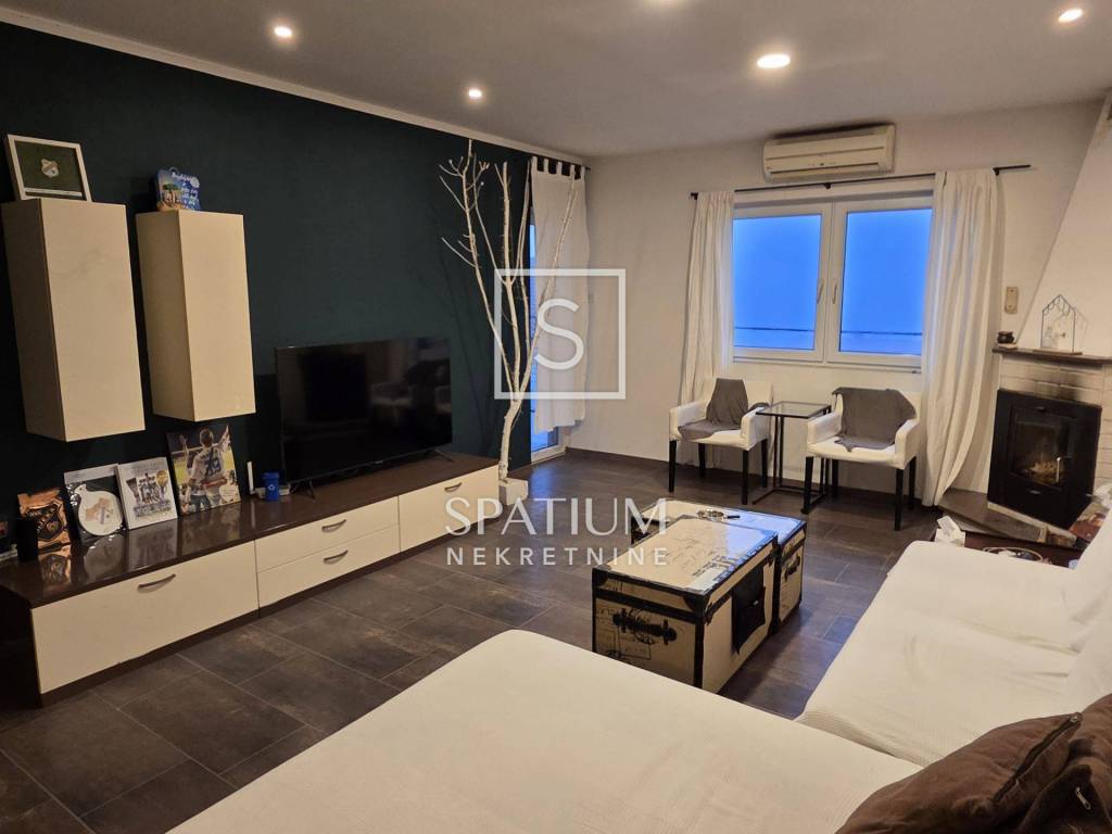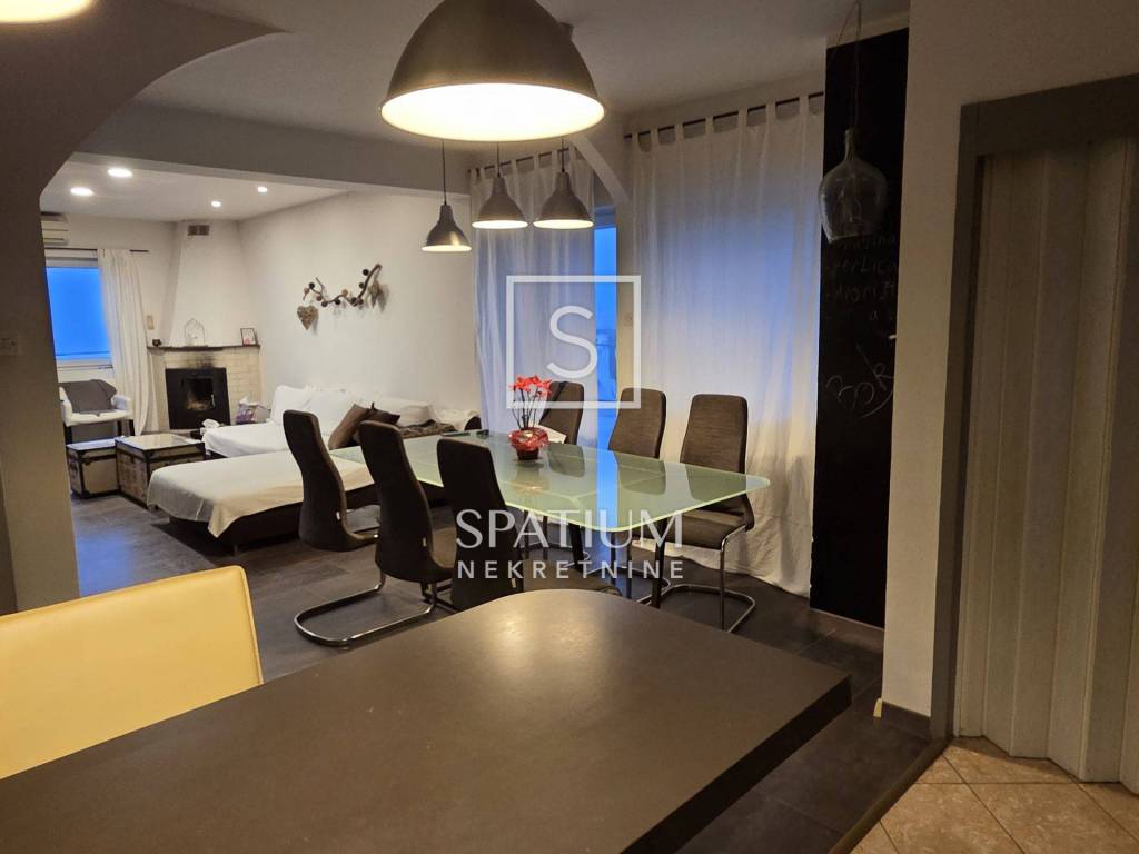 Na katu se nalazi potpuno uređen dvoetažni stan površine 110 m², koji se sastoji od: tri spavaće sobe ,prostranog dnevnog boravka s kuhinjom i blagovaonicom ,kupaonice i hodnika, velikog balkona s lijepim pogledom. Iz jedne spavaće sobe vode stepenice u visoko potkrovlje, gdje se nalazi ugodan i funkcionalan prostor sa spavaćom i dnevnom sobom, kupaonicom te velikom terasom s otvorenim pogledom na more.