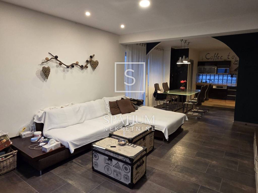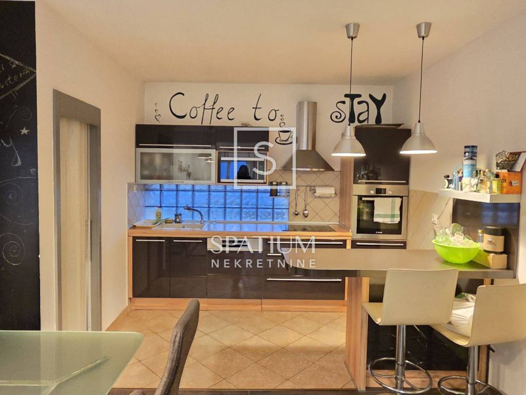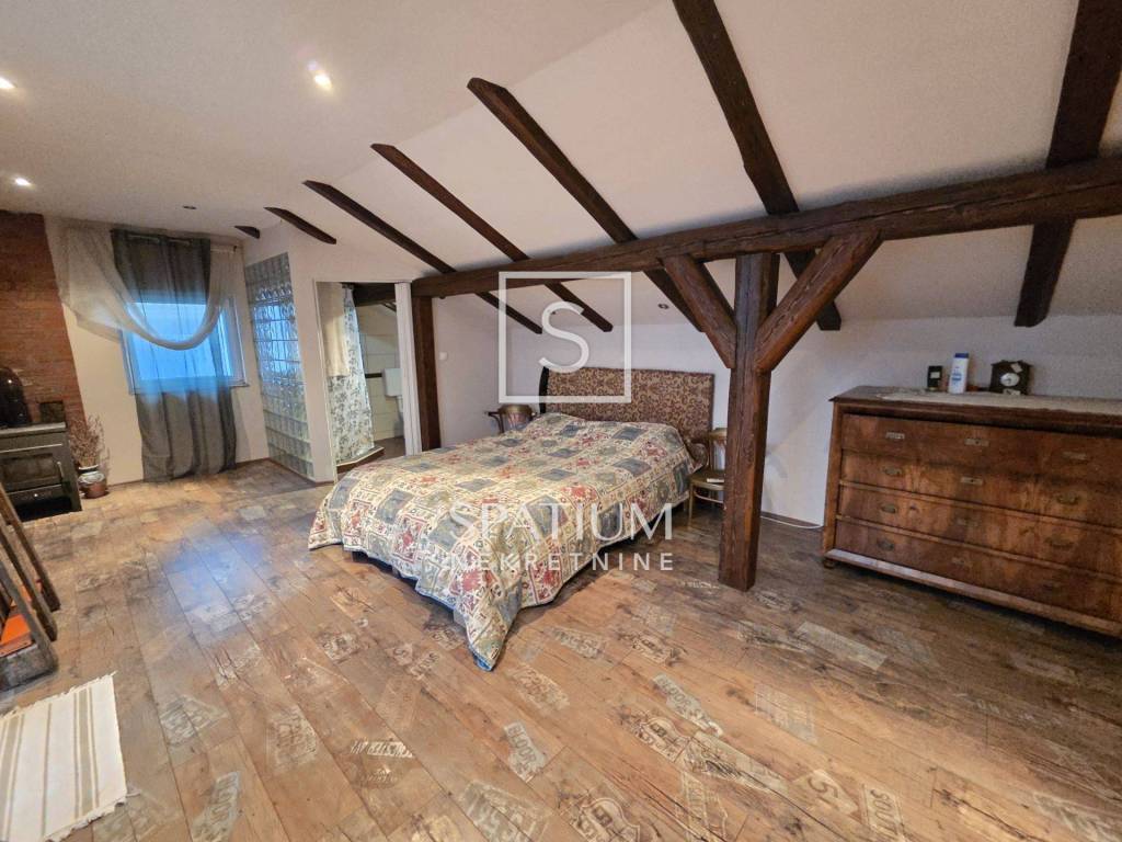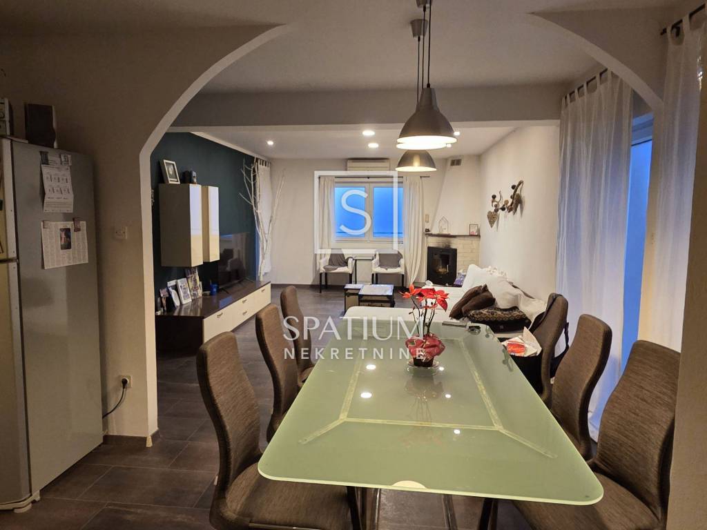 Na katu se nalazi potpuno uređen dvoetažni stan površine 110 m², koji se sastoji od: tri spavaće sobe ,prostranog dnevnog boravka s kuhinjom i blagovaonicom ,kupaonice i hodnika, velikog balkona s lijepim pogledom. Iz jedne spavaće sobe vode stepenice u visoko potkrovlje, gdje se nalazi ugodan i funkcionalan prostor sa spavaćom i dnevnom sobom, kupaonicom te velikom terasom s otvorenim pogledom na more.