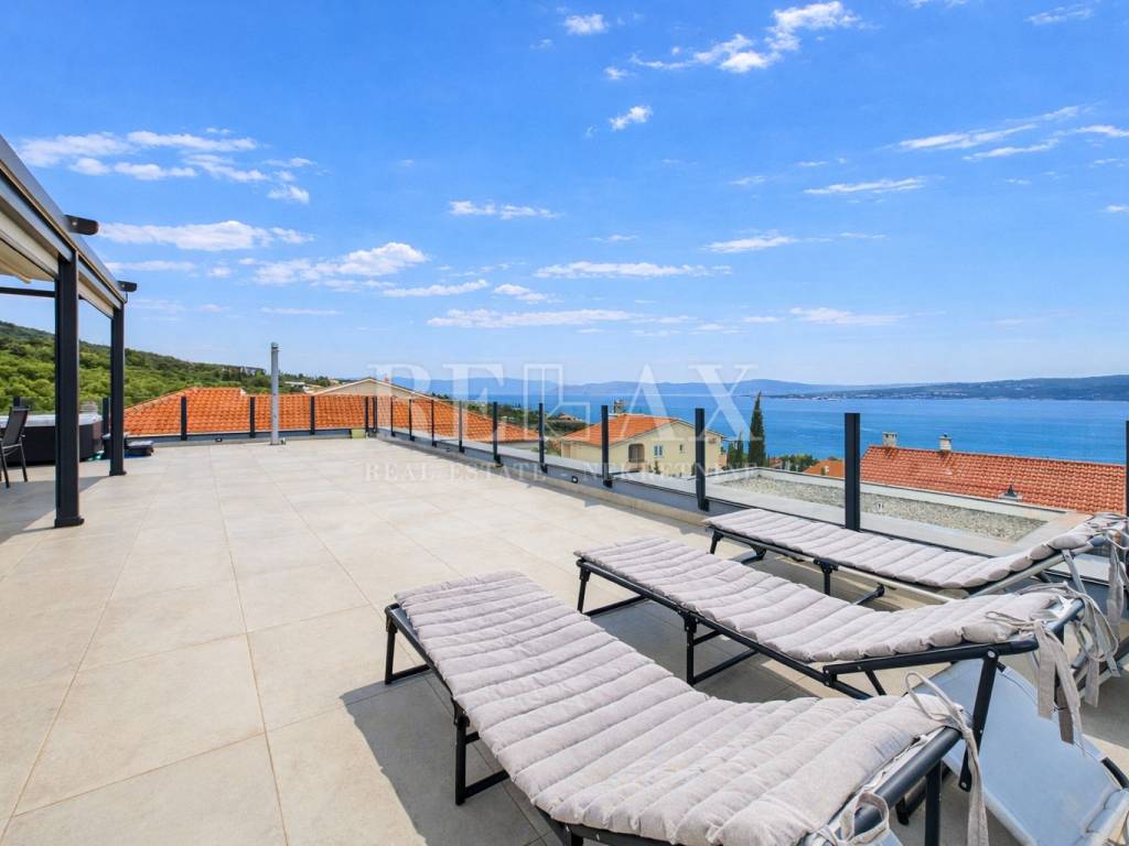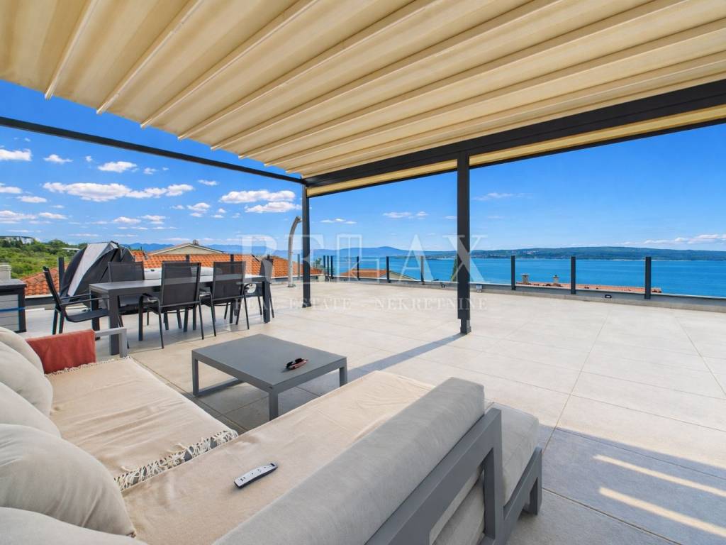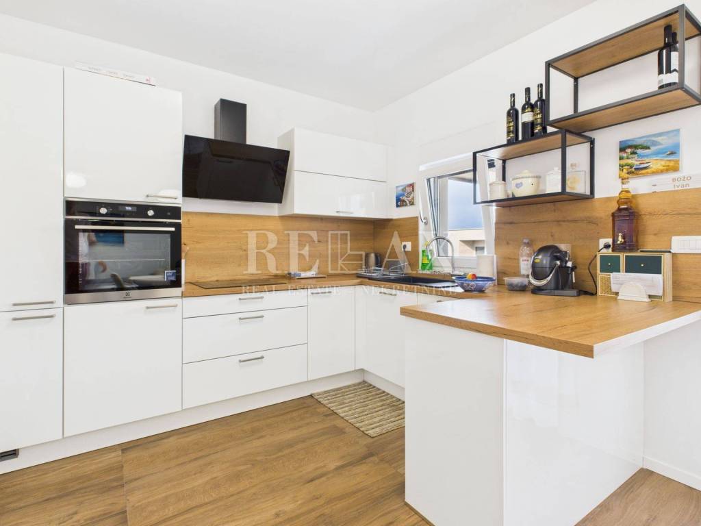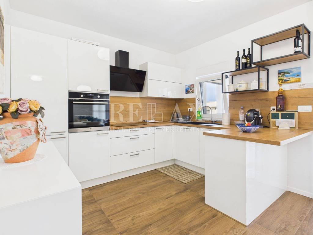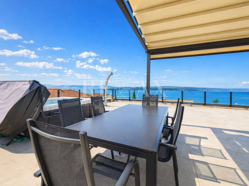 Dodatnu vrijednost stanu daju prostrane vanjske površine koje uključuju loggiu površine 21,84 m², nenatkrivenu terasu od 23,90 m², natkrivenu terasu od 5,39 m² te okućnicu veličine 17,71 m², idealnu za uživanje na otvorenom. Poseban dojam ostavlja krovna terasa koja nudi spektakularan panoramski pogled na more i okolicu. Opremljena je vanjskom kuhinjom i pergolom, stvarajući savršeno mjesto za druženja, objedovanje i opuštanje pod otvorenim nebom.