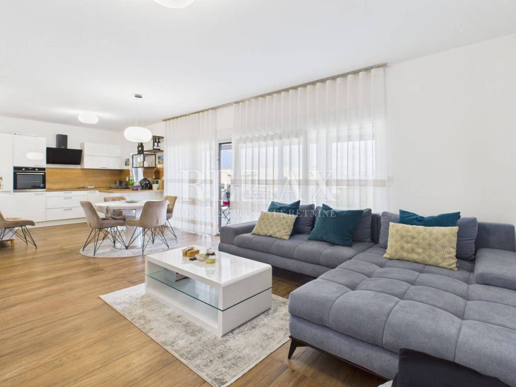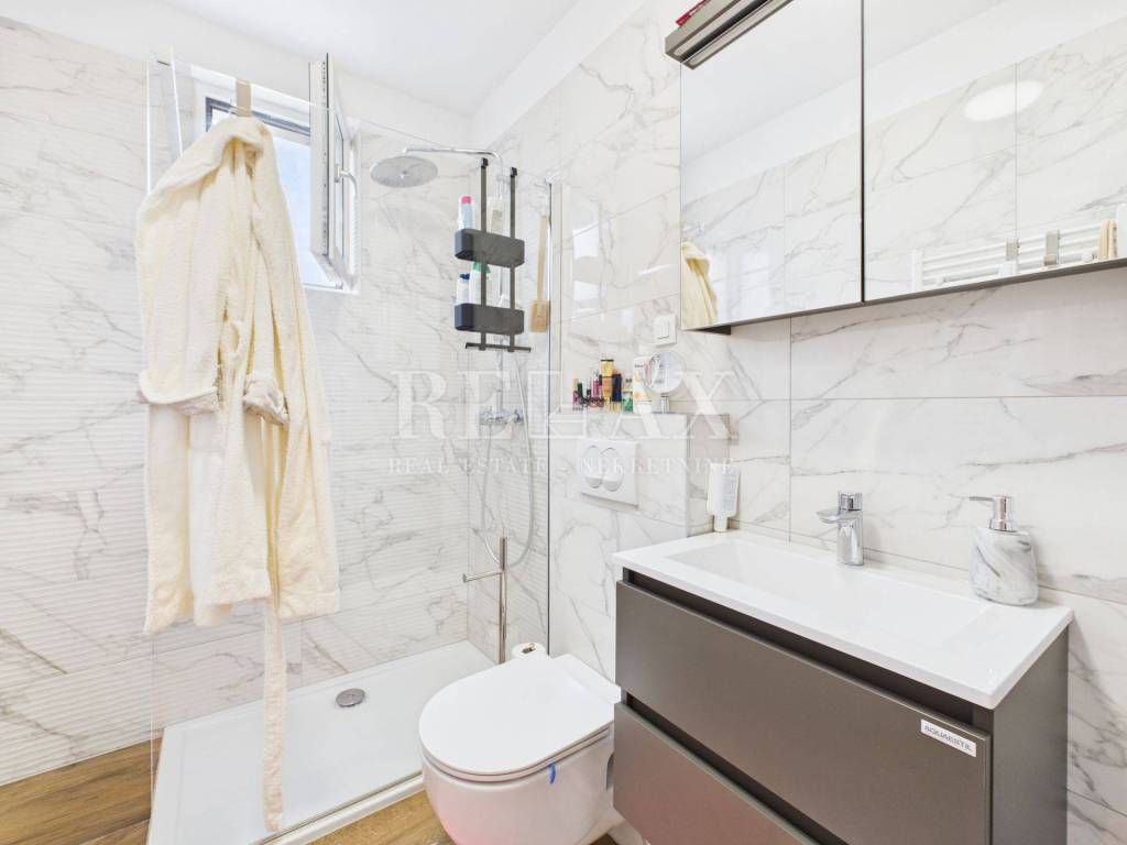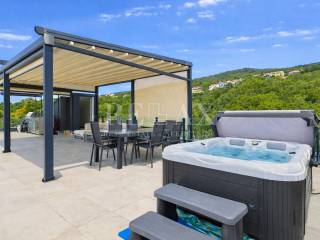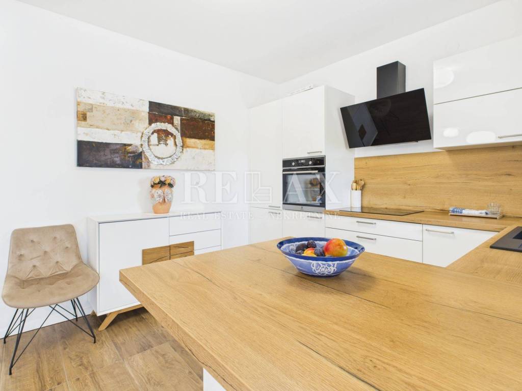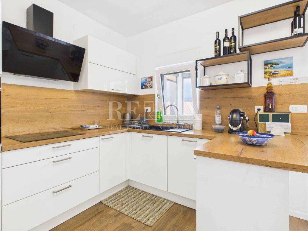 Dodatnu vrijednost stanu daju prostrane vanjske površine koje uključuju loggiu površine 21,84 m², nenatkrivenu terasu od 23,90 m², natkrivenu terasu od 5,39 m² te okućnicu veličine 17,71 m², idealnu za uživanje na otvorenom. Poseban dojam ostavlja krovna terasa koja nudi spektakularan panoramski pogled na more i okolicu. Opremljena je vanjskom kuhinjom i pergolom, stvarajući savršeno mjesto za druženja, objedovanje i opuštanje pod otvorenim nebom.