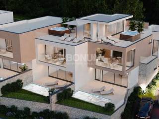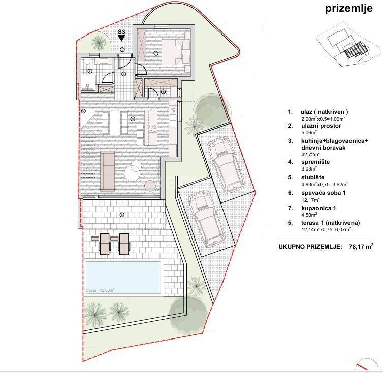 Na prodaju je ekskluzivna kuća S3 u modernom stambenom kompleksu u Vodicama, osmišljena za najviši standard stanovanja. Kuća se prostire kroz prizemlje, kat i krovnu terasu te nudi ukupno 171,67 m² stambene površine s terasama, uz prostrano dvorište, bazen od 15 m² i dva parkirna mjesta. Prizemlje se sastoji od ulaznog prostora, kuhinje s blagovaonicom i dnevnim boravkom, spremišta, spavaće sobe, kupaonice, stubišta i velike natkrivene terase povezane s dvorištem. Na katu se nalaze dvije prostrane spavaće sobe, svaka s vlastitom kupaonicom, hodnik i dodatne terase, dok krovna etaža donosi impresivnu terasu s prostorom za jacuzzi i boravak na otvorenom.