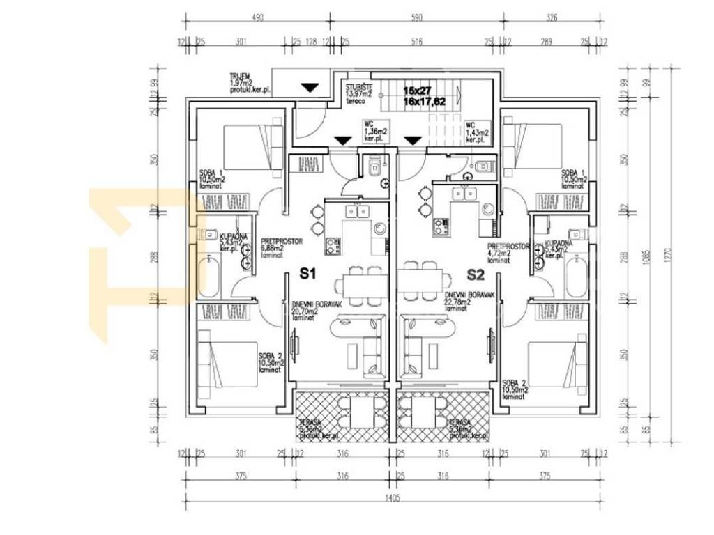 Ukupna površina stana iznosi 55,37 m², uz dodatnu terasu od 5,36 m², idealnu za opuštanje. Funkcionalan raspored obuhvaća prostrani dnevni boravak s kuhinjom i blagovaonicom, dvije komforne spavaće sobe, kupaonicu te zaseban gostinjski WC.