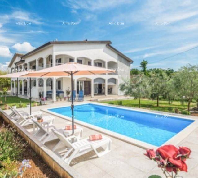 Na prodaju je prostrana kuća s ukupno 5 stambenih jedinica, bazenom, garažom, vrtom i dodatnim sadržajima, smještena u mirnom dijelu Poreča, samo 6 km od mora i 8 km od centra Poreča.Ukupna stambena površina: 365,66 m²Garaža + ostava: 31,95 m²Okućnica: 992 m²Stambene jedinice: 2 stana + 3 apartmana Raspored:PRIZEMLJE:Stan (136,23 m²) – hodnik, ostava, veliki dnevni boravak s kaminom, blagovaonica, kuhinja, kupaonica, 2 spavaće sobe (jedna s vlastitom kupaonicom), natkrivena terasa.Apartman – dnevni boravak s kuhinjom, spavaća soba, kupaonica, natkrivena terasa.KAT:Stan (74,06 m²) – dnevni boravak s kuhinjom i blagovaonicom, 2 spavaće sobe, kupaonica, natkrivena terasa.Dva apartmana – svaki s dnevnim boravkom i kuhinjom, spavaćom sobom, kupaonicom i natkrivenom terasom.Vanjski prostor:Bazen sa sunčalištem.Vrt površine 695 m².Ljetna kuhinja s ručno rađenim kaminom.Samostojeća garaža i više parkirnih mjesta.Tehničke karakteristike:Centralno grijanje na lož ulje.Solarni paneli za toplu vodu.Klima uređaji u svim jedinicama.Internet, telefon, gradski vodovod i kanalizacija.Asfaltiran pristupni put.Blizina sadržaja:Trgovina, vrtić, igralište, pošta – u neposrednoj blizini.Udaljenost od mora: 6.200 m.Ova nekretnina je idealna za obiteljski život, turistički najam ili investiciju. Za više informacija, molimo kontaktirajte: +385 91 611 57 06+385 98 420 885azra@almadominvest.com