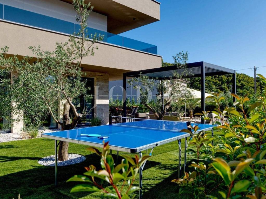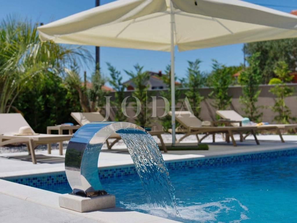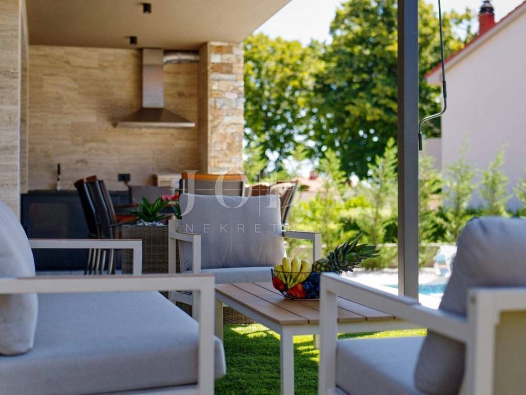 Na uređenoj okućnici nalazi se bazen sa vodopadom, sunčalište, te ljetna kuhinja.