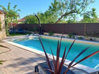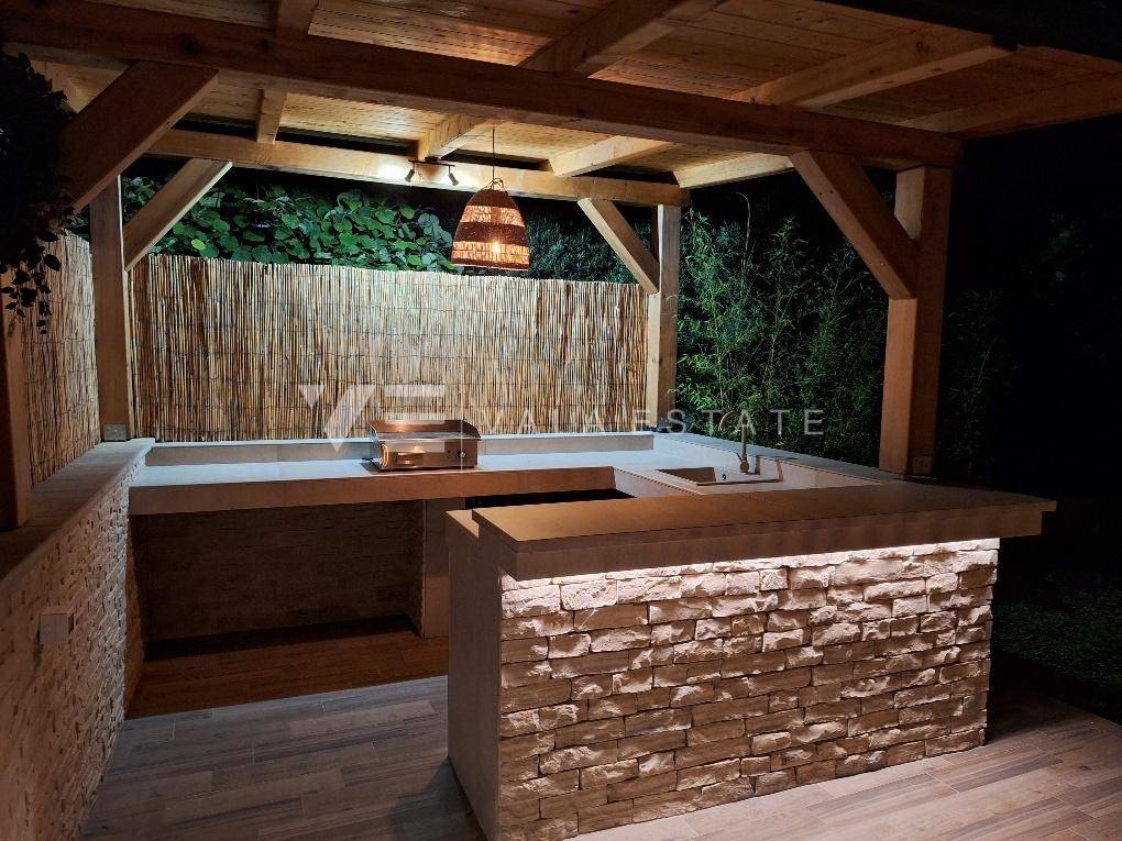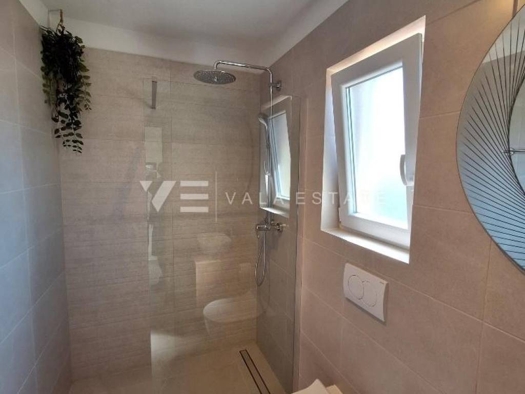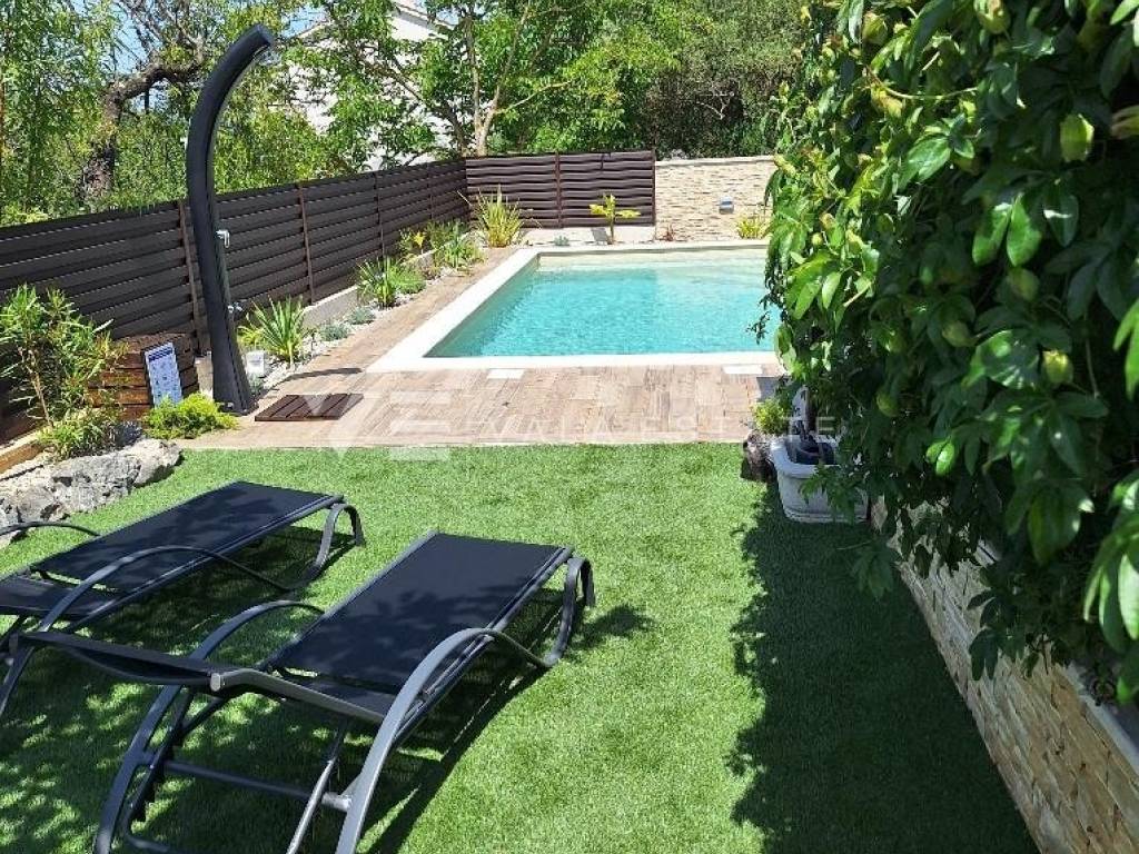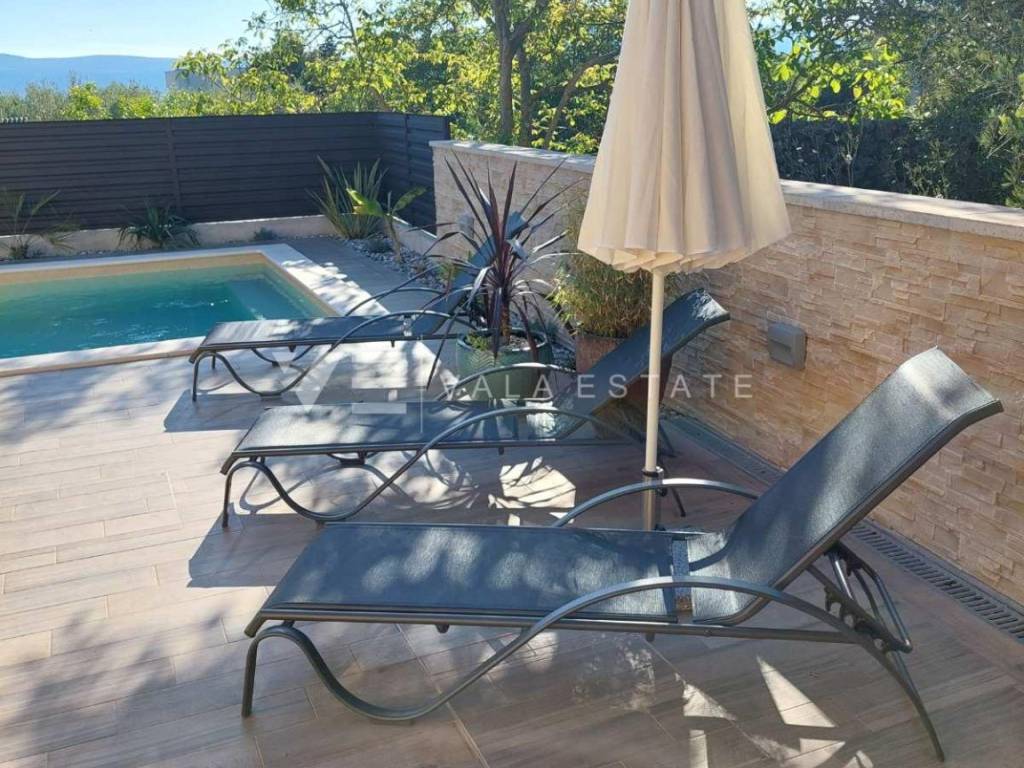 Nekretnine otok Krk, grad Krk okolica - na prodaju je samostojeća kuća stambene površine 140 m2 smještena na mirnoj lokaciji udaljenoj 2000 metara od mora i centra. Kuća je potpuno renovirana 2023. godine i proteže se na dvije etaže. Prizemlje se sastoji od dvije odvojene stambene jedinice. Jedna obuhvaća ulazni prostor, kupaonicu, dvije spavaće sobe i prostor koji objedinjuje kuhinju, blagovaonu i dnevni boravak s izlazom na natkrivenu terasu i okućnicu. Druga se sastoji od ulaznog prostora, sobe za fitness i kuhinje s izlazom na terasu, kupaonice i spavaće sobe u prizemlju i još jedne prostrane spavaće sobe i kupaone na katu koji je povezan unutarnjim stepeništem. Za renovaciju su se koristili kvalitetni materijali i oprema, visokokvalitetne podne obloge i sanitarije, ima multi split klimatizaciju, PVC stolariju, potpuno je namještena modernim novim namještajem i kao takva se i prodaje. Na lijepo uređenoj i ograđenoj okućnici koja nudi privatnost nalazi se potpuno opremljena ljetna kuhinja s natkrivenom terasom i prostorom za druženje, grijani bazen, sunčalište i tri parkirna mjesta. Izvrsna prilika za investiciju u svrhe turističkog iznajmljivanja, ali i vlastitog stanovanja.