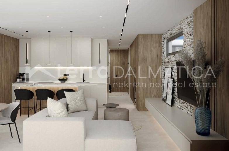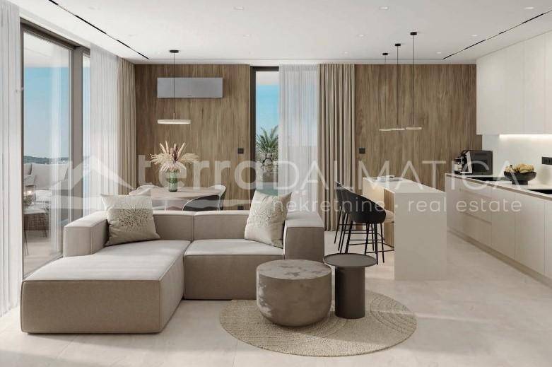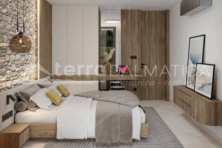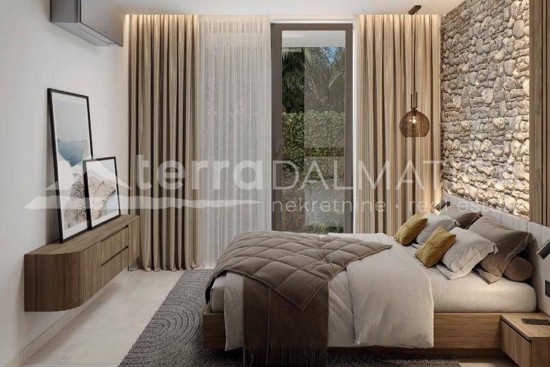 Stan se sastoji od ulaznog prostora koji vodi do dvije spavaće sobe, prostrane dnevne sobe s kuhinjom i blagovaonicom, te dvije kupaonice. Velike terase savršeno su mjesto za uživanje u pogledu na more. Posebna prednost ovog stana je privatni bazen površine 23 m², zajedno sa strojarnicom bazena i spremištem.